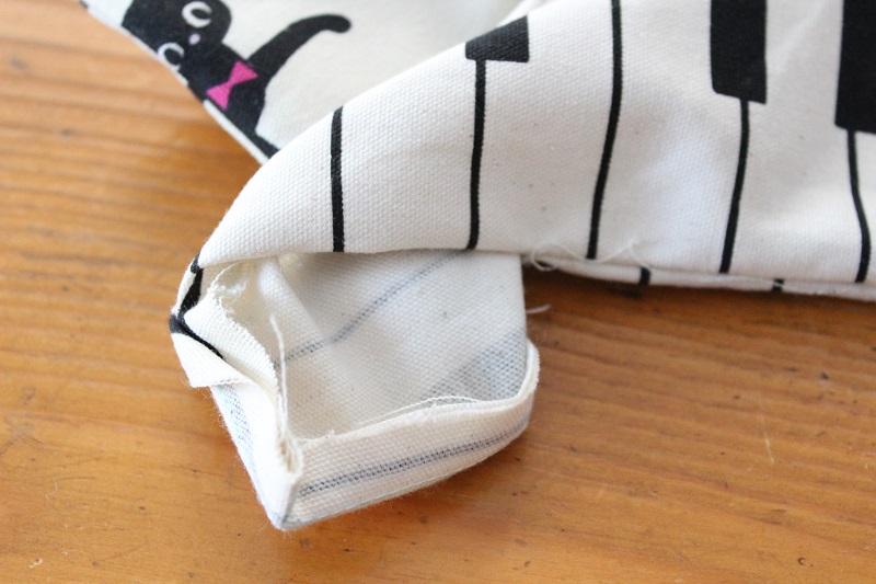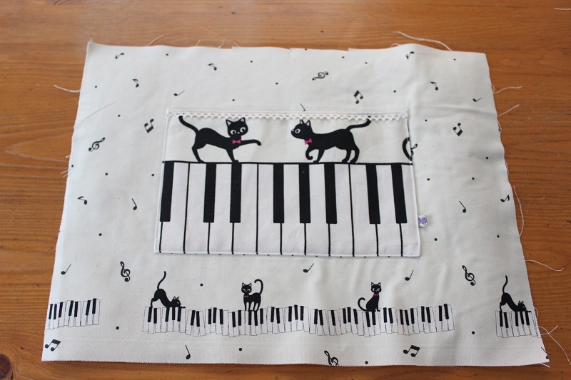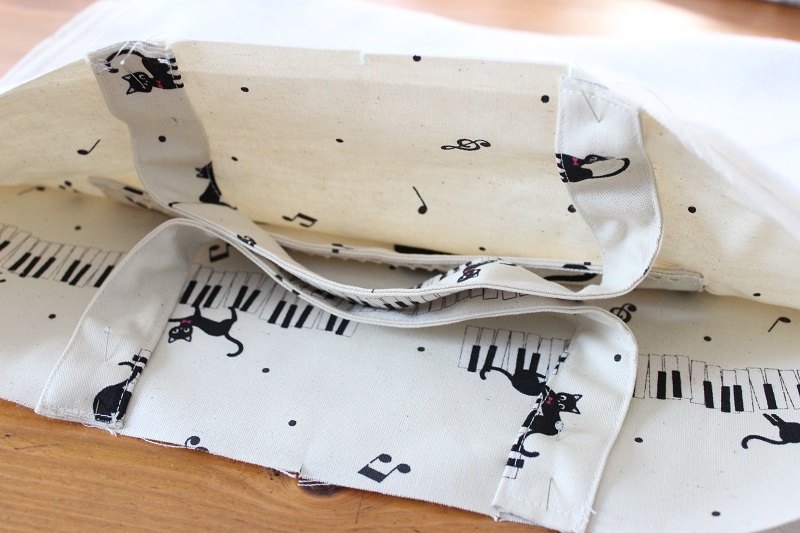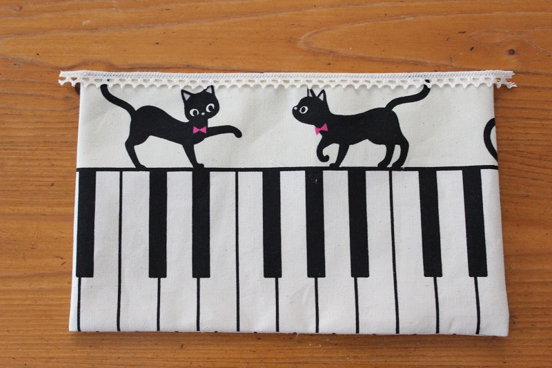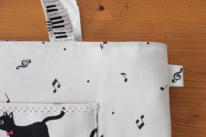 I thought, “This fabric is definitely for children” – the cute and playful piano key design makes you want to trace along the keys. Also it will be fun to carry around a bag made of this fabric. Loveable kitties are used as the lining, creating two different ways to enjoy the design of this reversible bag.