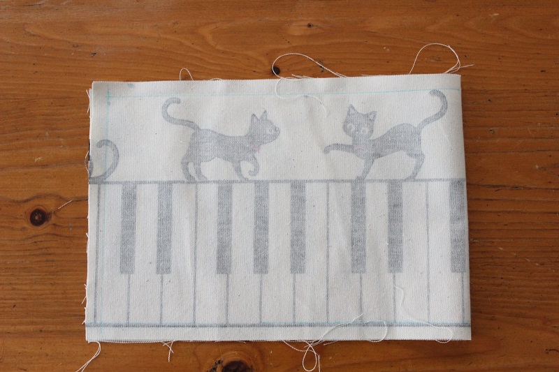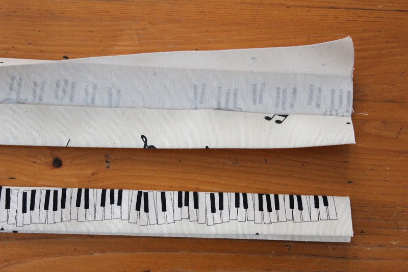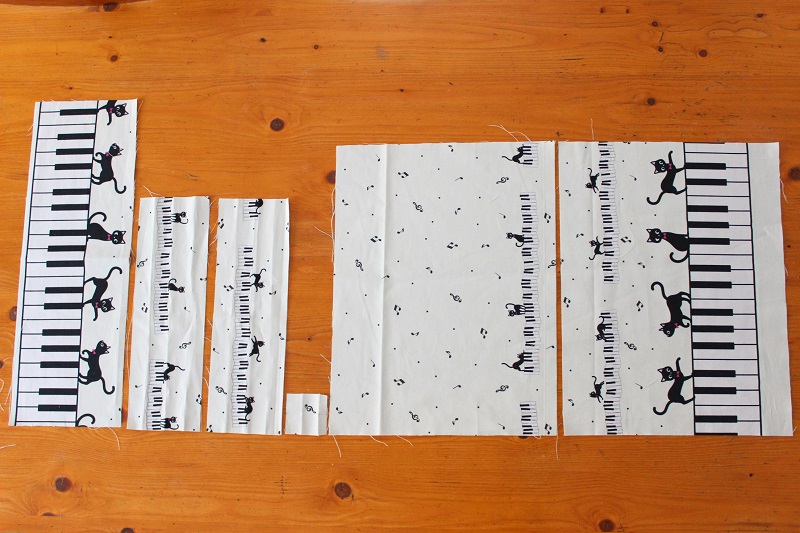 First prepare a piece of main fabric cut at 50cm. The piano key design is applied as the width of the bag. Besides the pocket, the width of the cut pieces should be 42cm. From left to right: pocket, handle, handle, tab, front/outer fabric, back fabric.