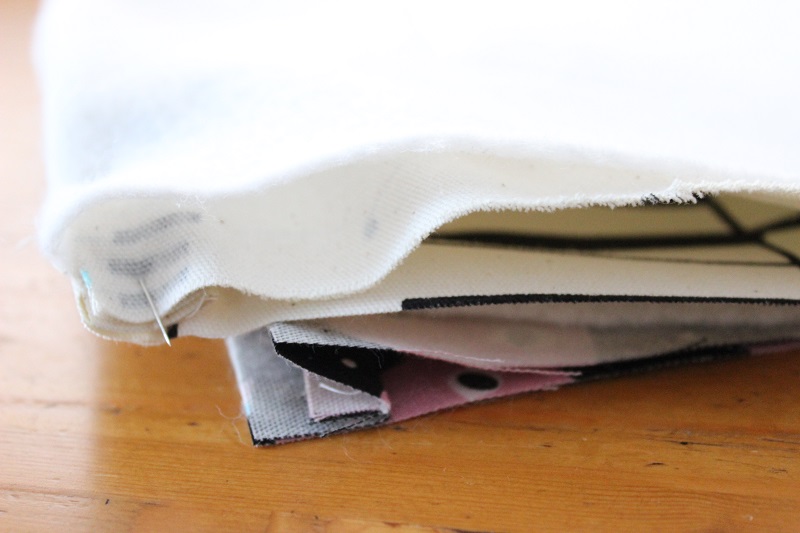 Turn the front/outer fabric from step 10 inside out, and place the bag into the lining fabric. Put the opening together with front/outer sides facing each other. As seen in the photo, press down each seam allowance to other sides of each other to keep it flat. Pin the fabrics together and sew around the bag’s opening.