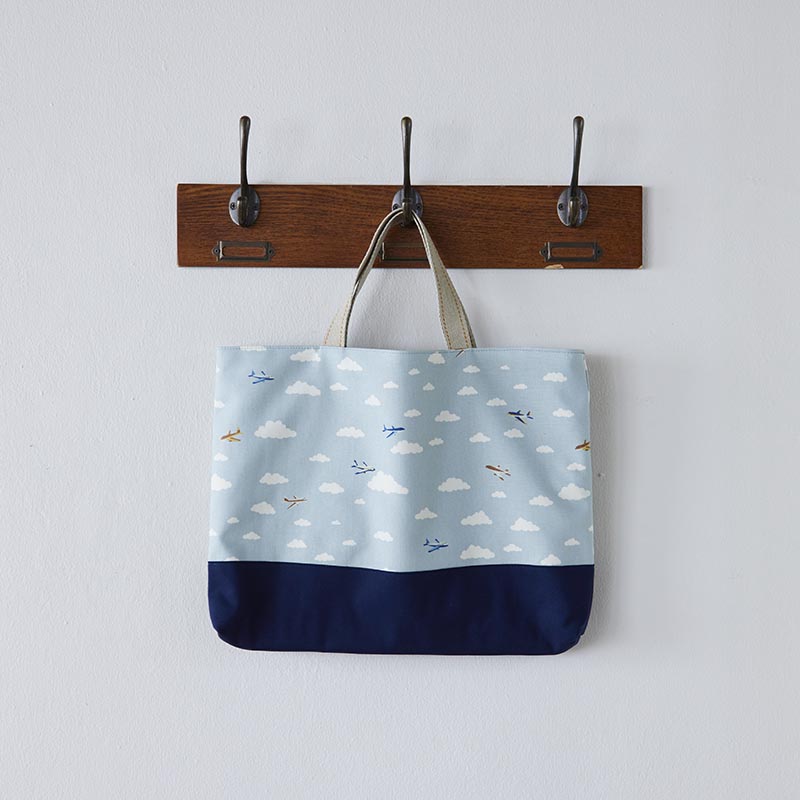 Used for going to schools and classes, this lesson bag combines two fabrics with a dark colored bottom which helps to keep it from showing any dirt and stains. The fabric used for this bag is “Natural Boy,” in the airplane print. It is cotton 100% sheeting.