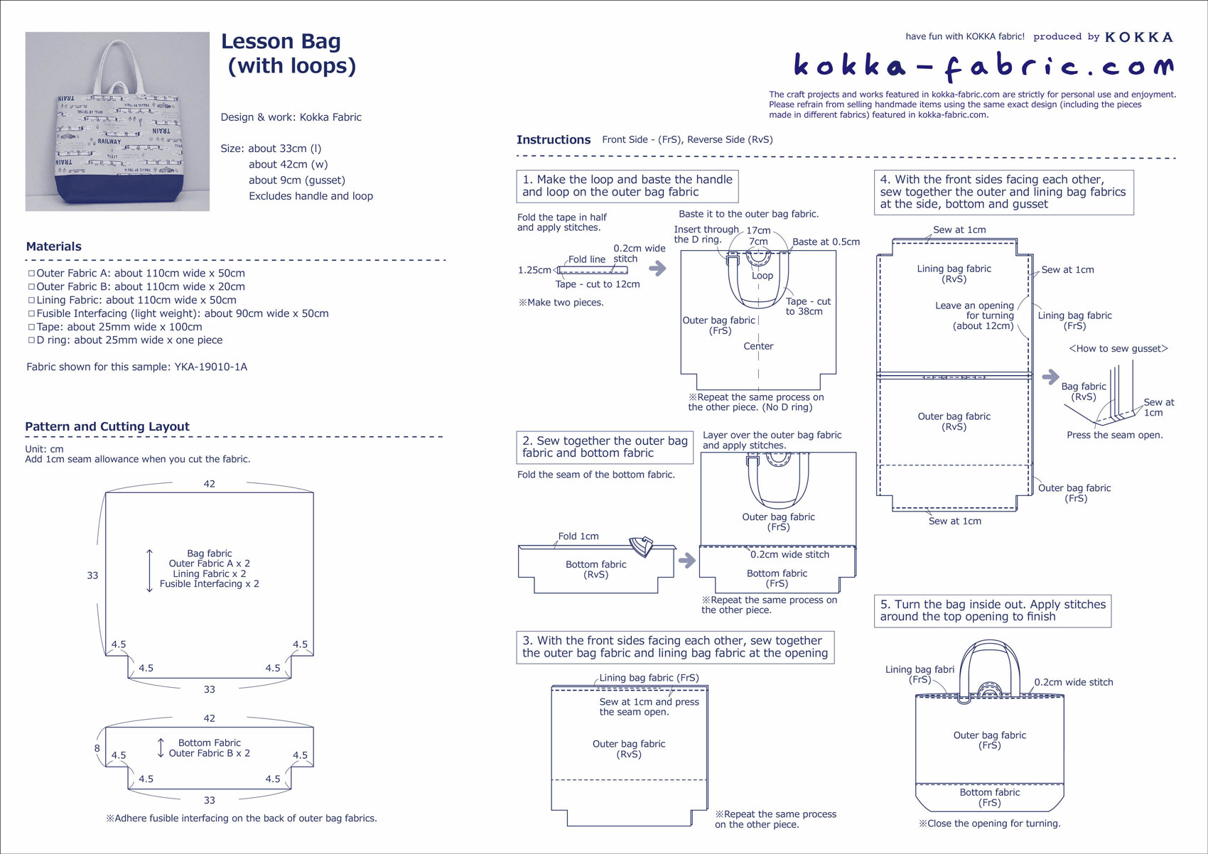 - Lining Fabric: about 110cm wide x 50cm