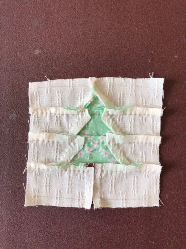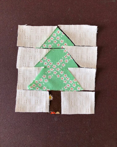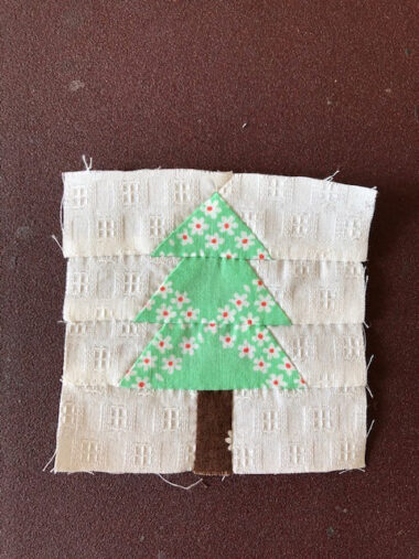 When working on the patchwork fir, make sure to align the matchmark of each piece of the patch fabric when you piece together. By incorporating several kinds of light and dark shades for the green scrap fabric, it can create a joyful variation.