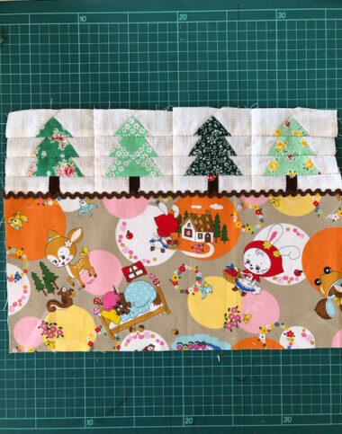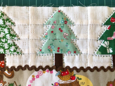 Using the same pattern, make four pieces of fir trees in different fabrics and piece them together side by side. Piece together the little red riding-hood fabric underneath. Attach the rick rack tape along the seam line in the front.