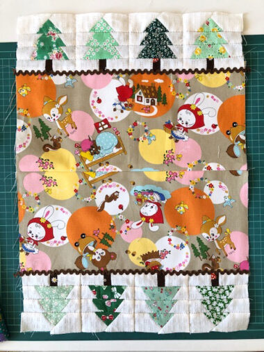 Every pattern is colorful and cute, and it was hard to decide which one to use. For this project, I picket the Little Red Riding Hood pattern. To create the feel of a story, I combined the design with the patchwork pattern of a fir tree. It portrays the scene where the little girl is walking through the forest to visit her grandmother.