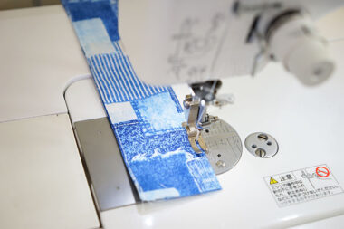 Make the handles. With the front sides facing each other, fold in half lengthwise. Sew the long end and turn it over.