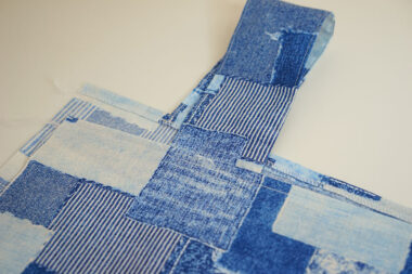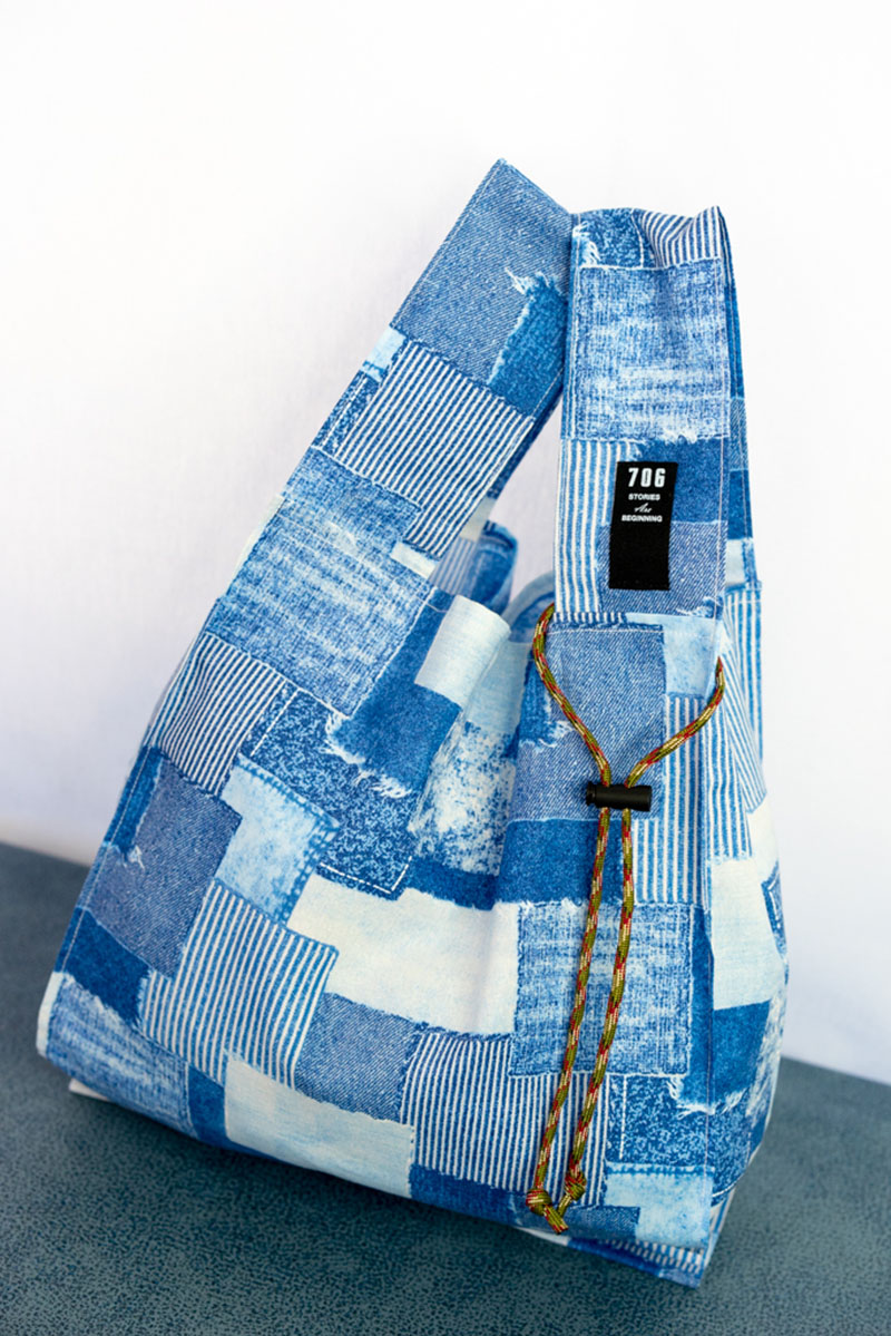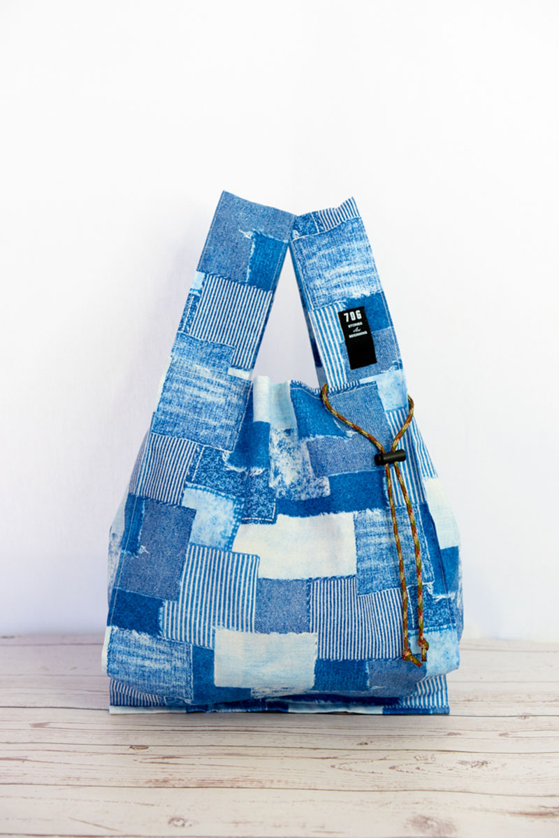Since single-use plastic shopping bags are no longer free at stores, “my reusable (eco) bag” has become a standard item. This bag in a plastic shopping bag design can be used not just by men, but by women, children and adults. A perfect fit for the whole family. Featured is a fabric from the “Men’s Eco Bag Kikaku (Plan)” series. As the name suggests, the denim design bag is fit for men to carry. 100% cotton sheeting is easy to sew and is recommended for sewing beginners.