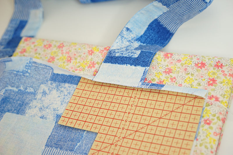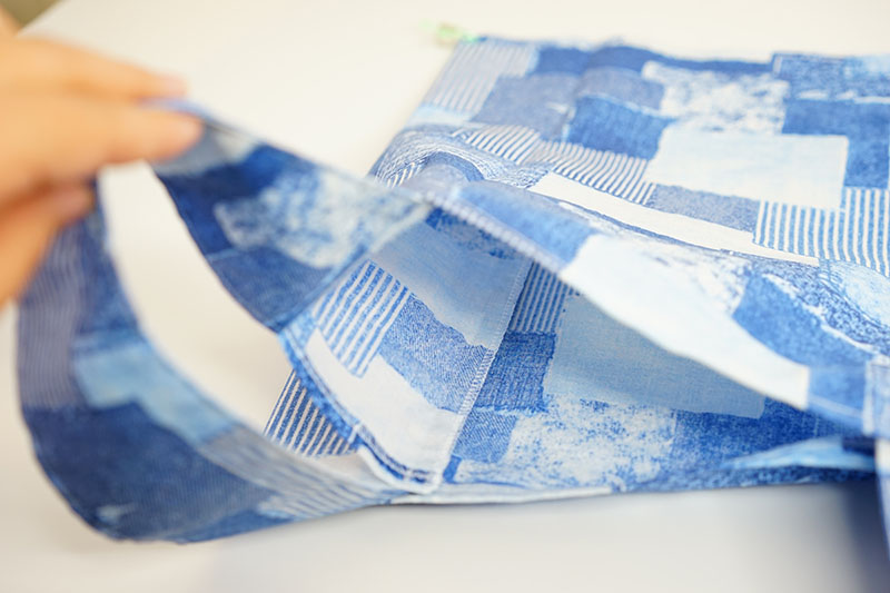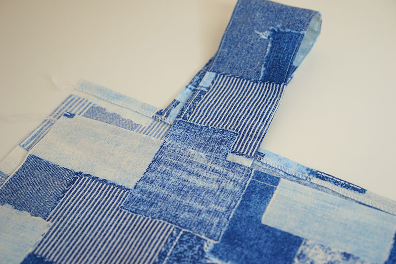 Make the handles. With the front sides facing each other, fold in half lengthwise. Sew the long end and turn it over.