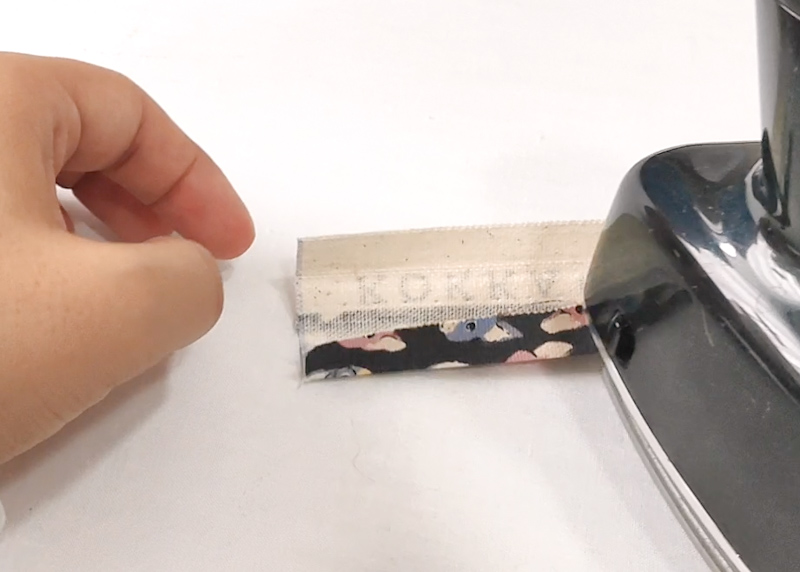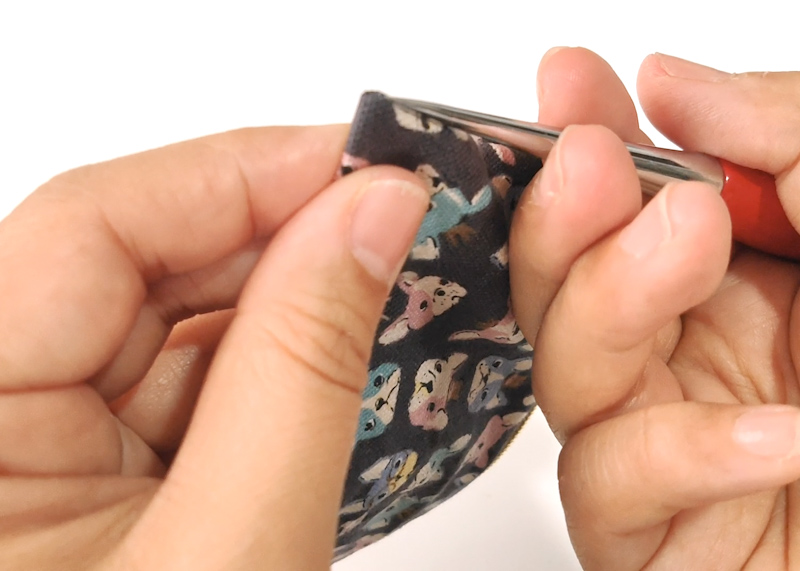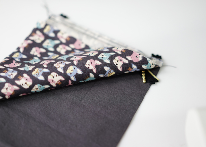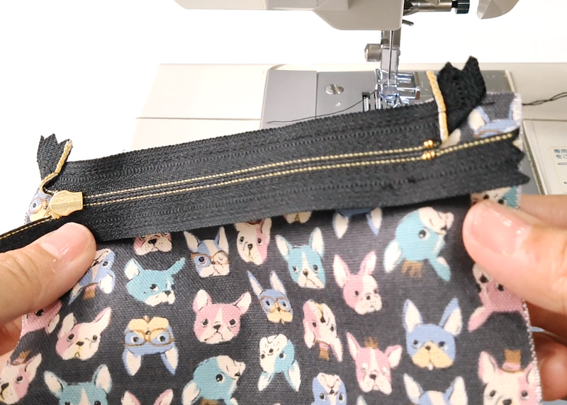 With the front sides facing each other, put together the outer fabric and zipper, and fold zipper ends to the lining side. Baste with 0.5cm seam.