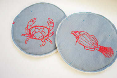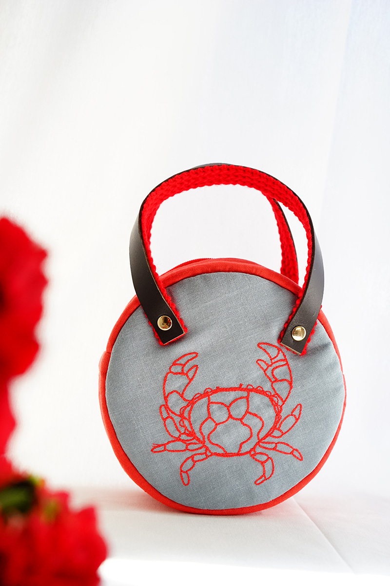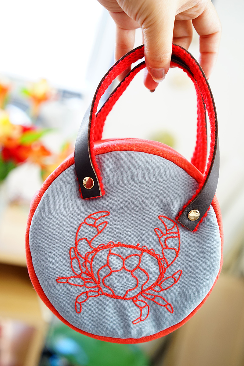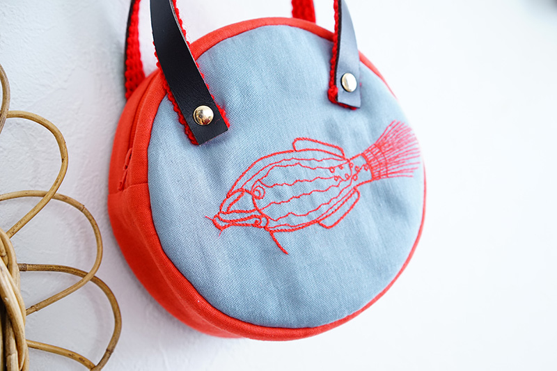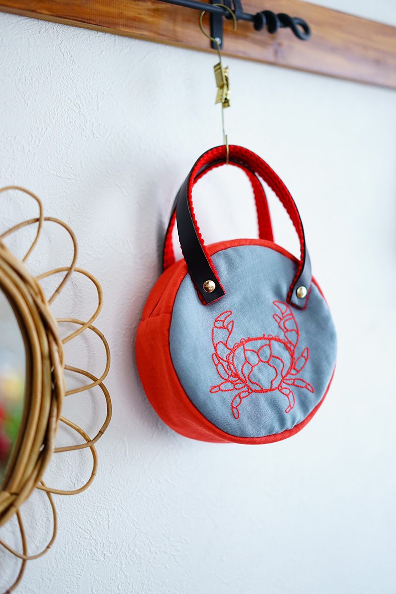 The crab motif is very unique and cute. I turned it into a micro bag with this impactful motif. The gentle touch of the double gauze is wonderful, and the color combination with the embroidery is all so stylish that I also wanted to make more in other colors.