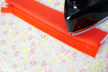 Attach the zipper on the top gusset fabric. Place the zipper in-between the outer and lining fabrics, with front sides facing each other and sew together.