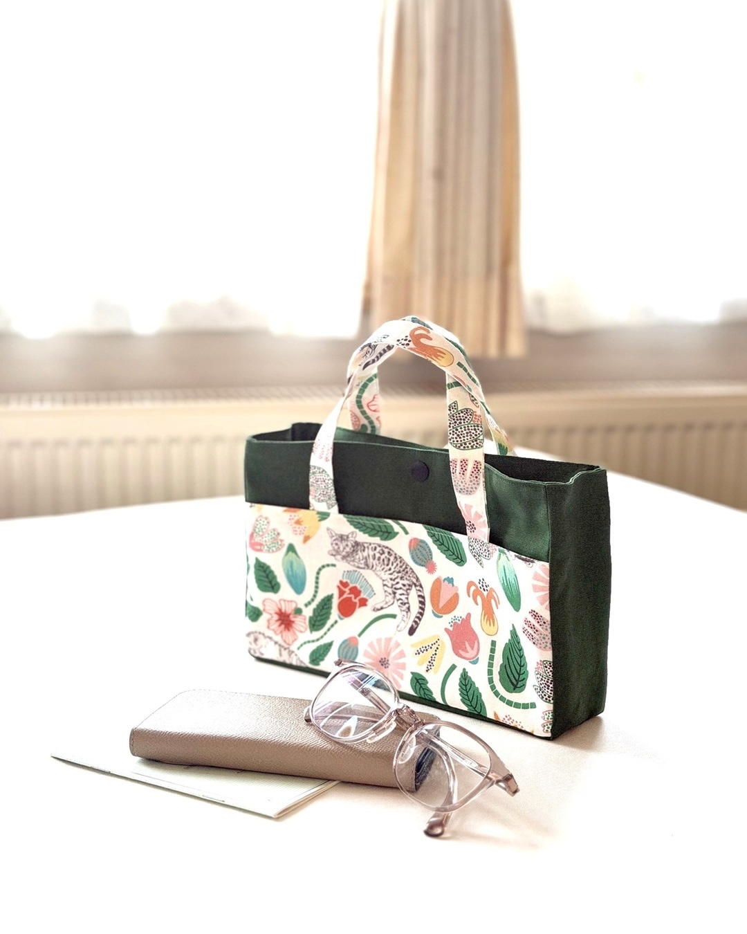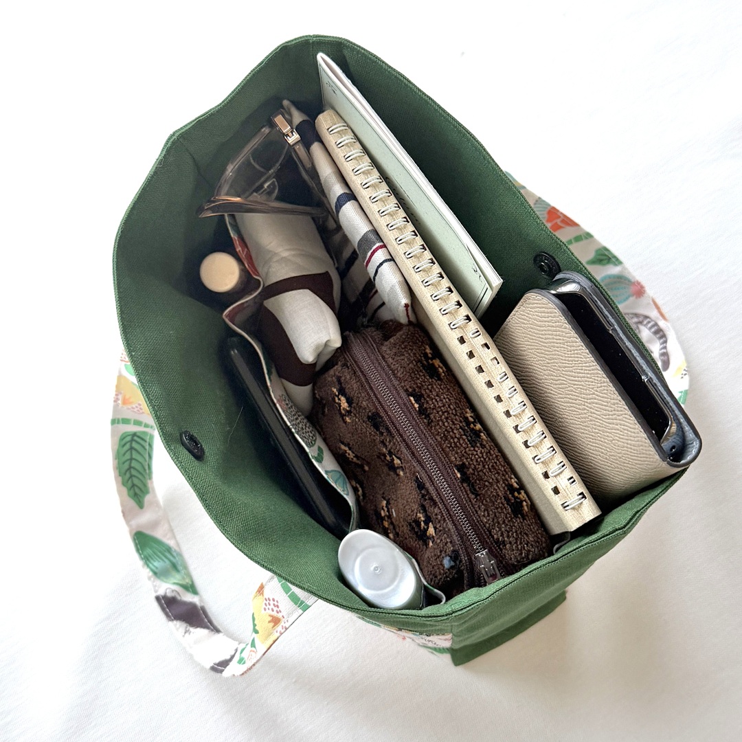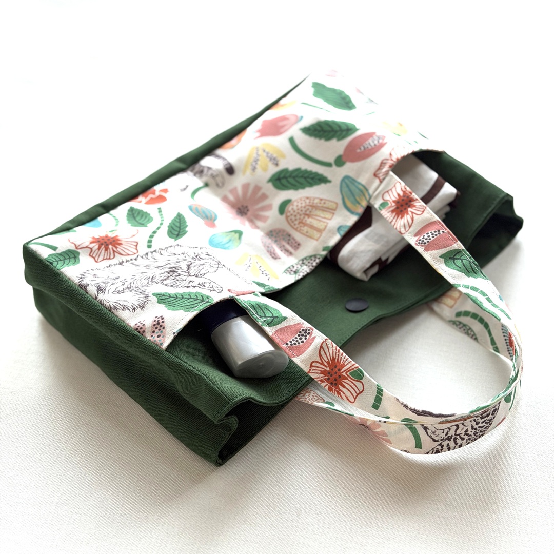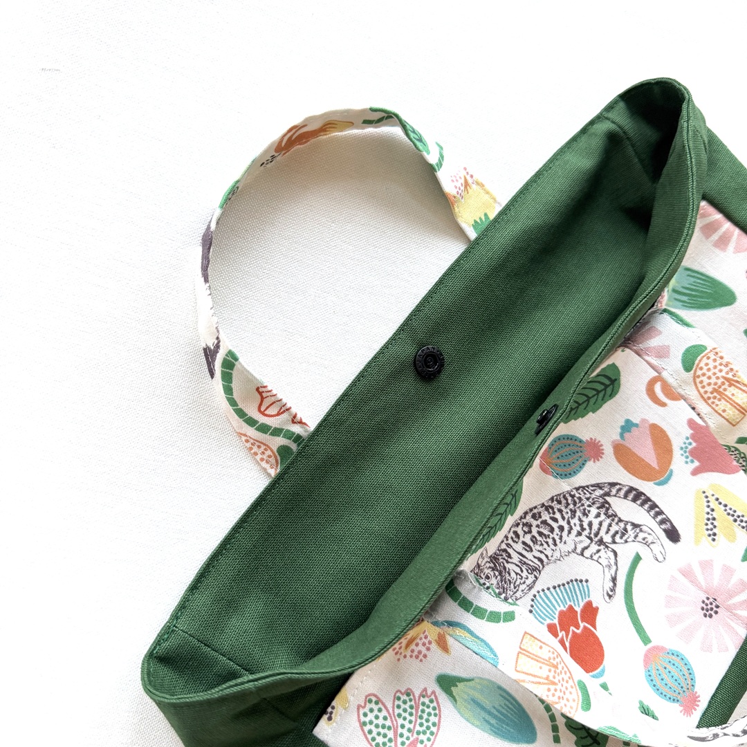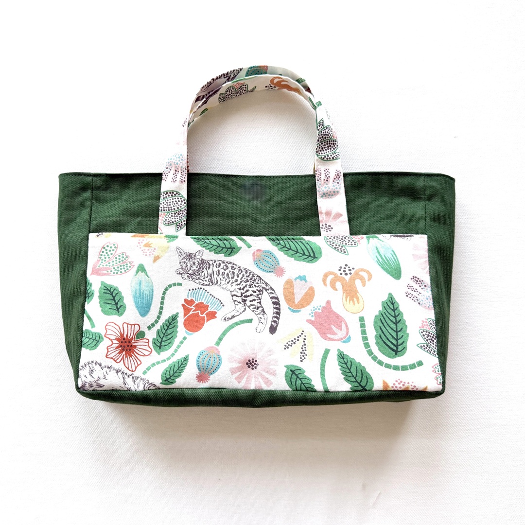 This tote bag is versatile enough to use as a compact bag for an outing or as a bag-in-a-bag. The fabric used for this bag is the [Cat Garden] design from the “365.CAT.ART” series. It features cats looking perfectly content amidst colorful flowers. Made from 100% cotton sheeting, it is an easy-to-sew fabric that is ideal for crafting bags and accessories.