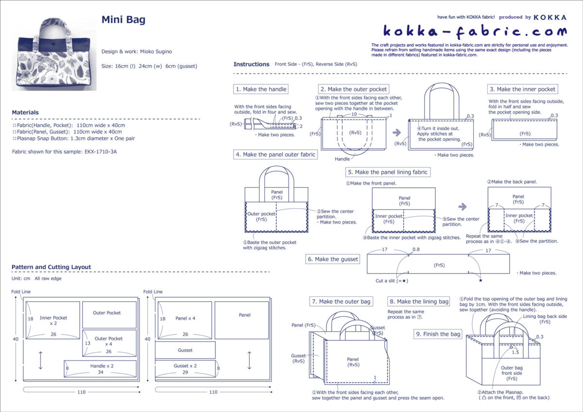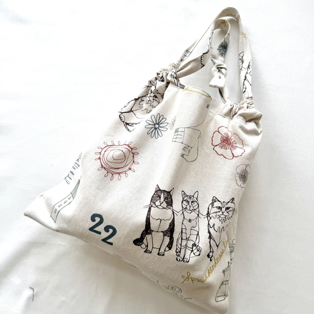 This tote bag is versatile enough to use as a compact bag for an outing or as a bag-in-a-bag. The fabric used for this bag is the [Cat Garden] design from the “365.CAT.ART” series. It features cats looking perfectly content amidst colorful flowers. Made from 100% cotton sheeting, it is an easy-to-sew fabric that is ideal for crafting bags and accessories.