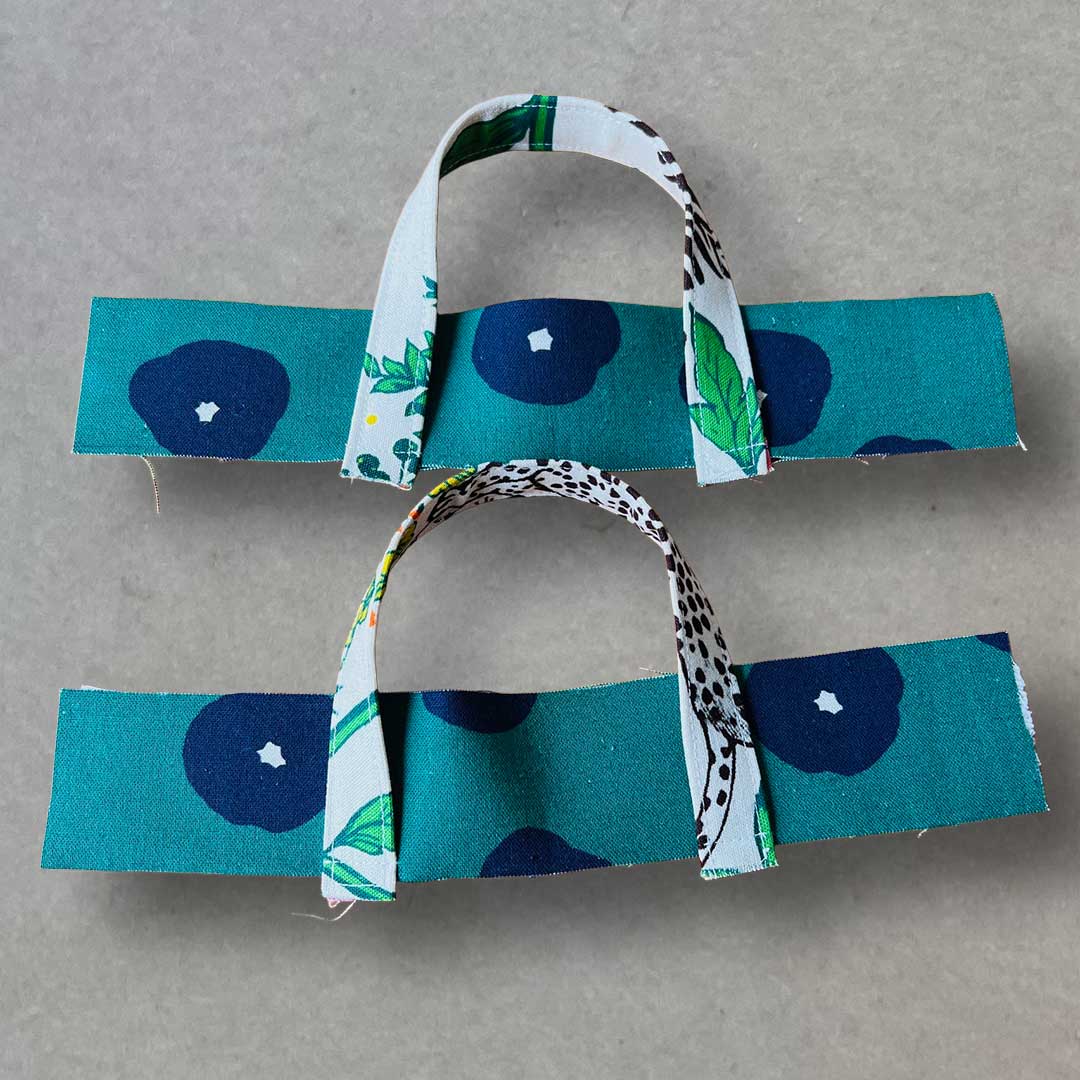 Baste the handles to the top edge of the outer fabric. Make two sets.