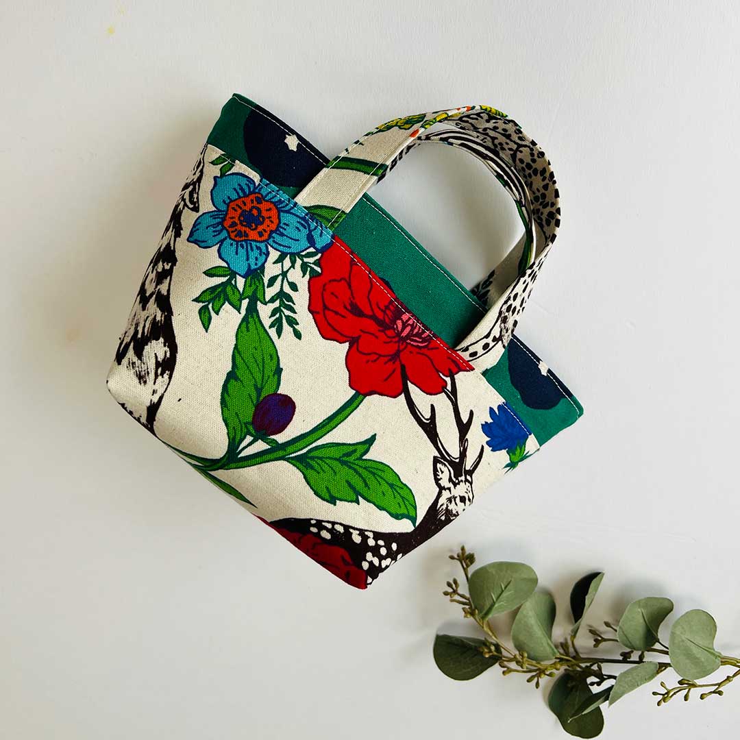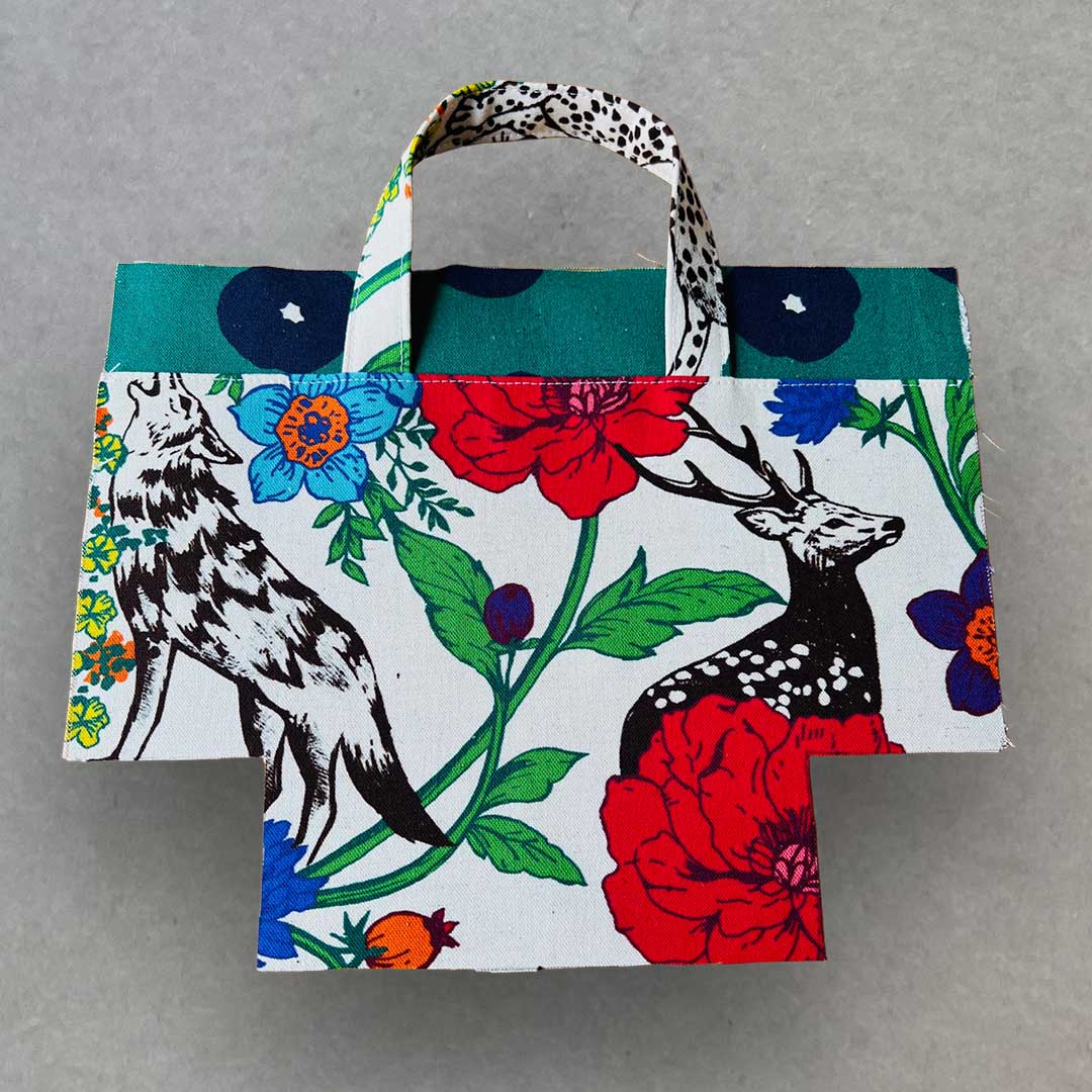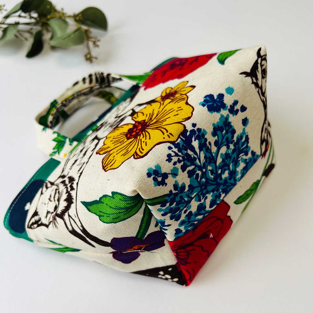 This compact tote bag is perfect for a quick walk or outings. The highlight of the design is the use of two different outer fabrics with the handle extending from where these two designs meet. The fabrics used for this bag are echino's [wonder], featuring a vibrant floral and bird print, and echino's [fluff] with dots on a solid pattern covering the entire fabric. Both are cotton-linen canvas, easy-to-sew, and highly suitable for bag making.