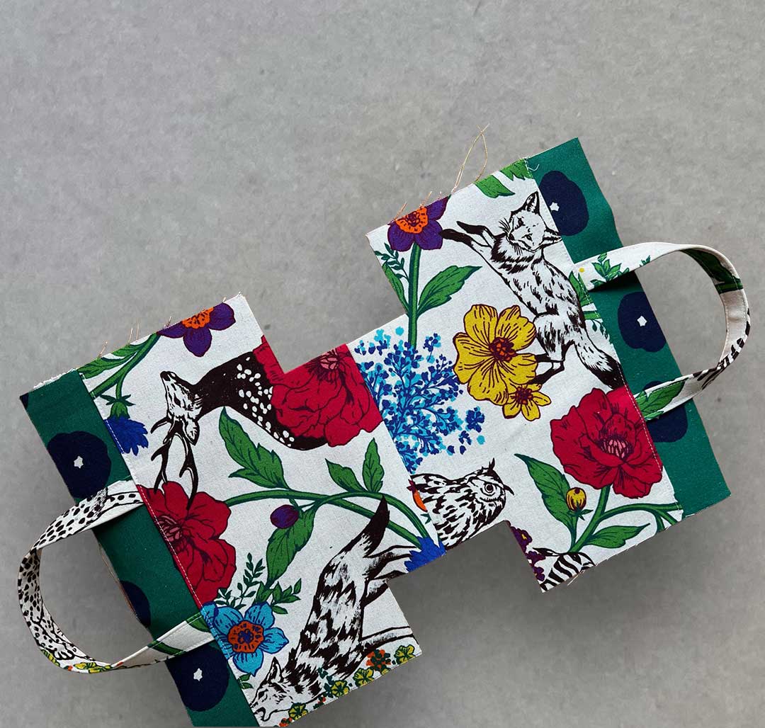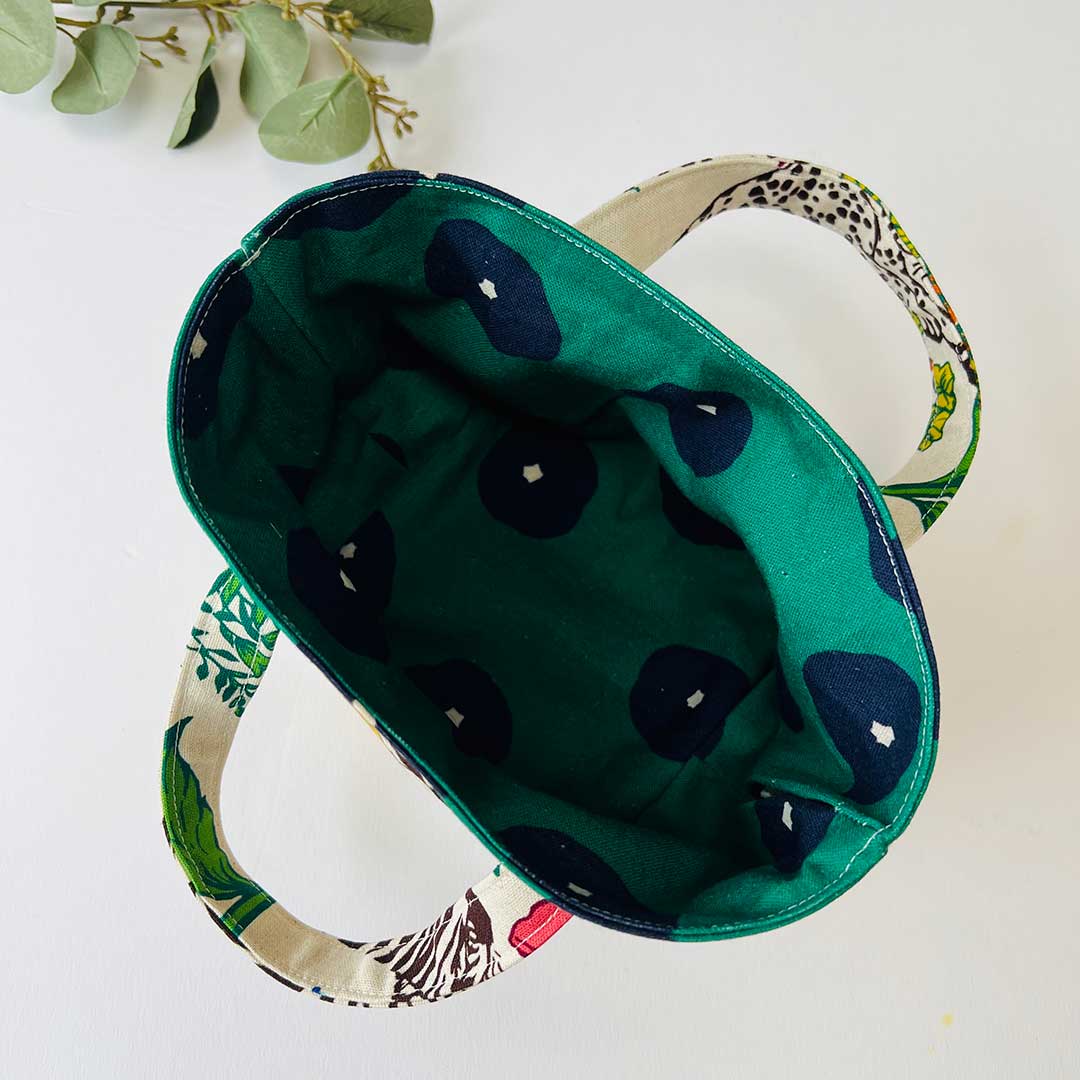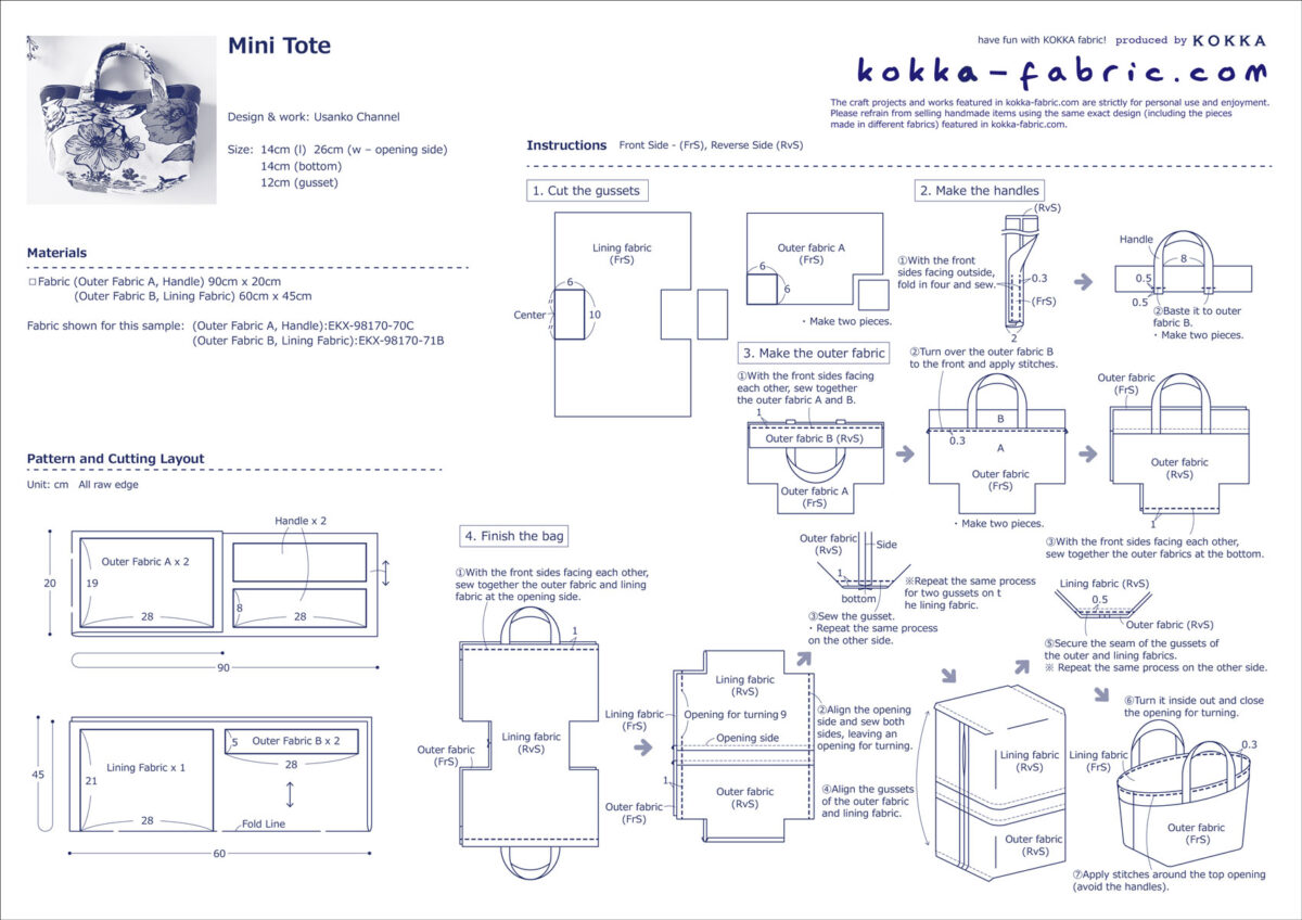This compact tote bag is perfect for a quick walk or outings. The highlight of the design is the use of two different outer fabrics with the handle extending from where these two designs meet. The fabrics used for this bag are echino's [wonder], featuring a vibrant floral and bird print, and echino's [fluff] with dots on a solid pattern covering the entire fabric. Both are cotton-linen canvas, easy-to-sew, and highly suitable for bag making.