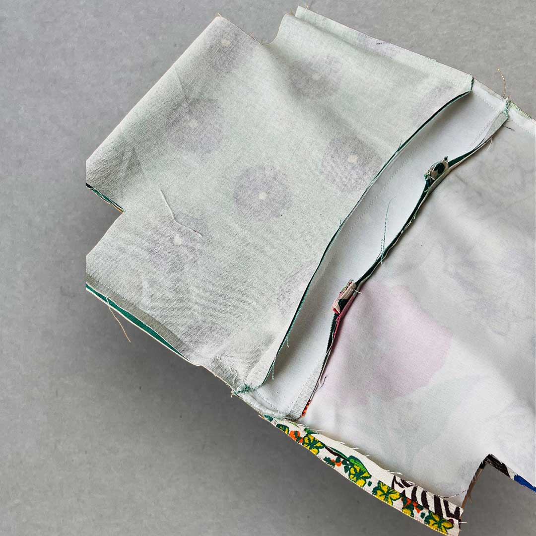 Sew together the top of the outer fabric (with handles attached) to the bottom of the outer fabric to form one piece of outer fabric. Press down the seam to the bottom side and apply topstitches along the seam from the front side.