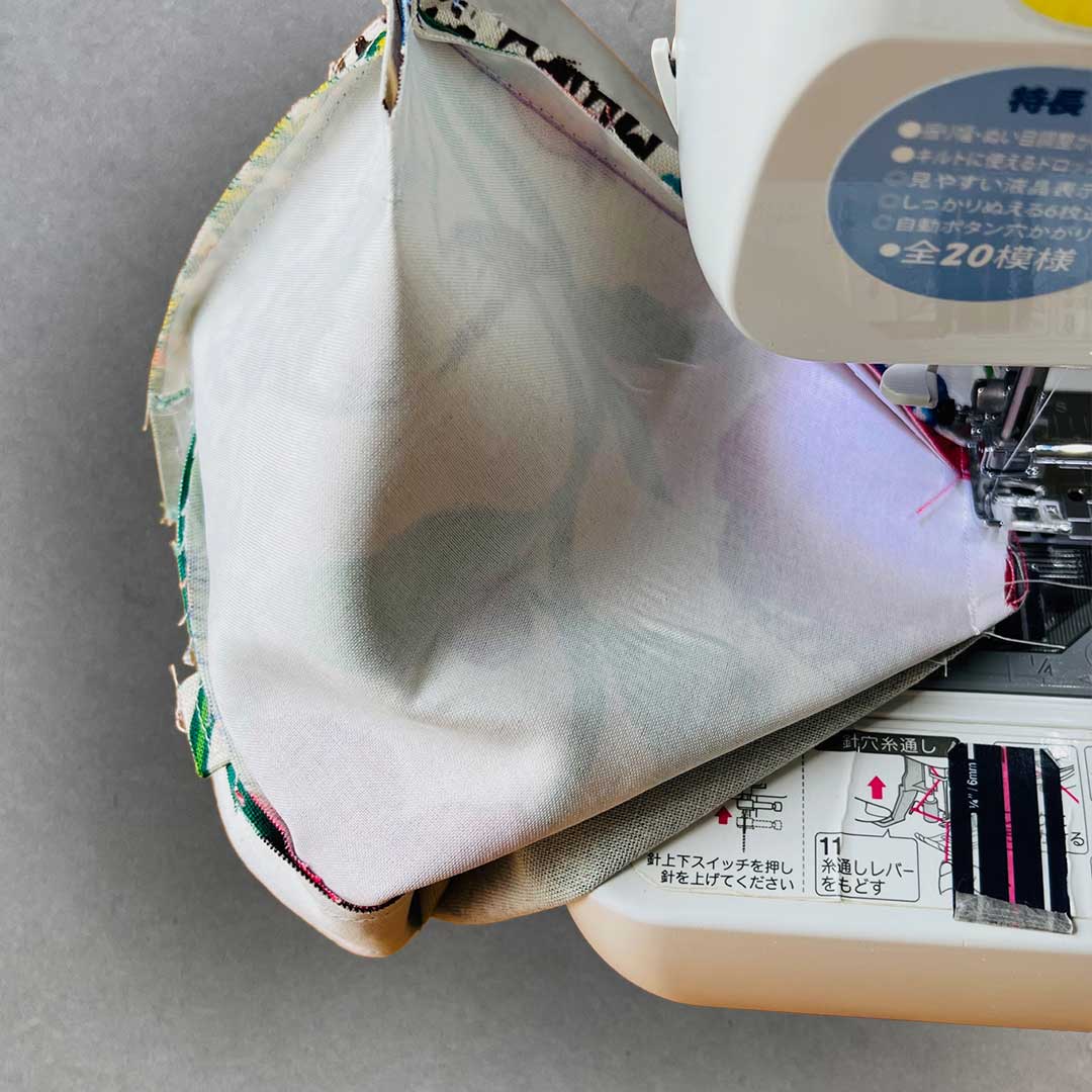At the center of the bag opening, overlap the gusset sections of the outer fabric side (without the opening for turning) and the lining fabric side. Sew them together with a 5mm seam allowance. ※This prevents the lining fabric from being pulled when turning the bag inside out.