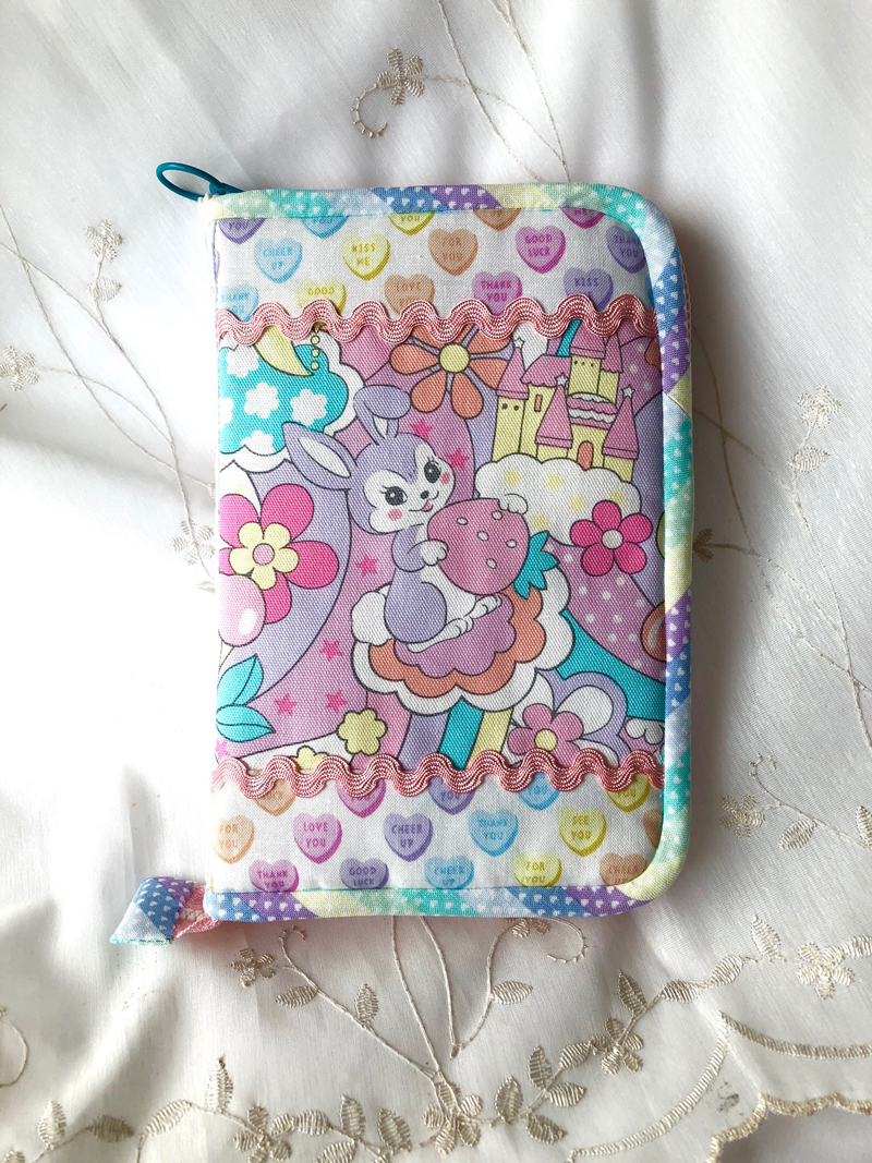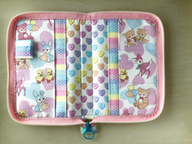 This multi-purpose case allows you to carry a variety of cards and items. The zipper closure will make it safe and secure. The lovely rabbit and bear animal print fabric is from the PASTEL POP series. The coordinated multiple color tones with a feature animal design combined with small hearts fabric are perfect to enjoy making patchworked items