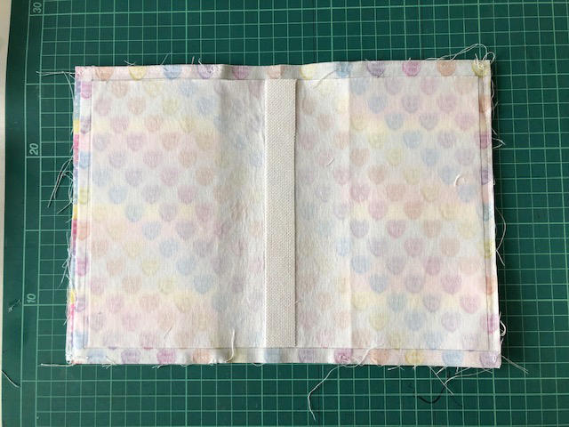 Iron the light weight fusible interfacing (18cm x 26cm) on the back of the lining fabric. Place the stiff interfacing (18cm x 2cm) over the position of the spine and iron to adhere.