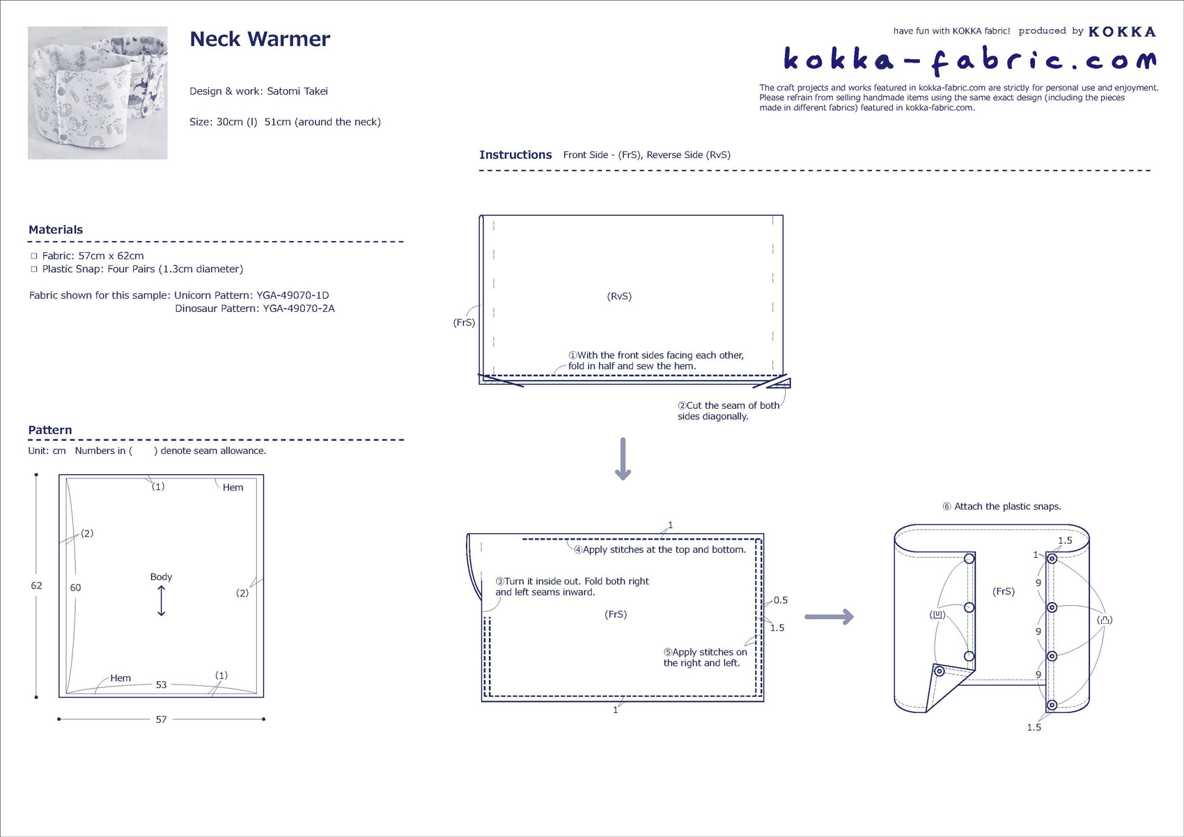 Children’s masks come in various sizes, so it would be good if you could change the position of the plastic snaps and the size of the fabric according to your child’s body. When wearing it as a face mask, it is easier to use if the snaps are placed in the back. It’s more comfortable to your skin than fleece or boa, and it is foldable into a small piece, so you can use it to keep your child warm or as a mask in case of emergency. Once you get the hang of it, it’s an easy sewing project that can be done in a short time, so please give it a try.