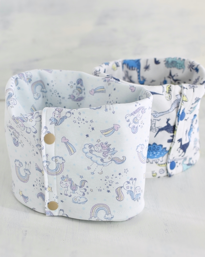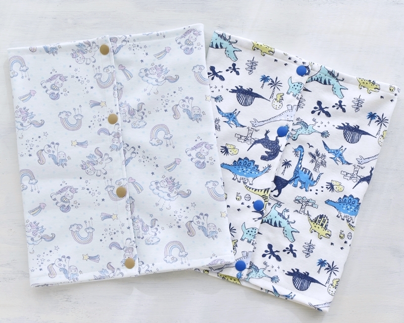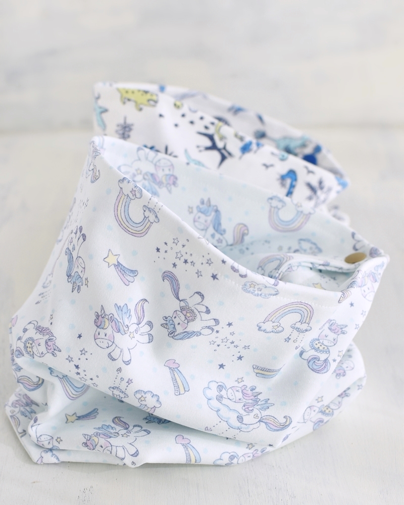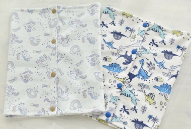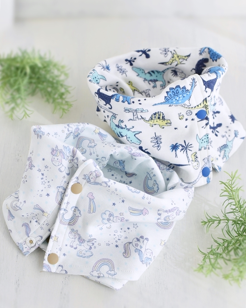 As the texture is smooth like a cross between gauze and fleece, I made it into a neck warmer and a face mask. Featuring kids’ favorite motifs of fairy tales and dinosaurs, I think they will be happy to use it because the material is not as stiff and scratchy as fleece.