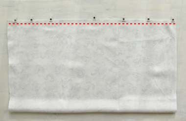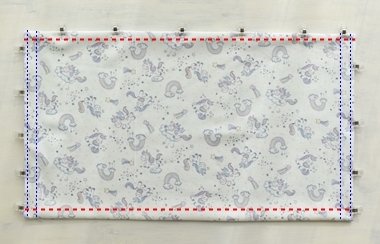Red dotted lines (top and bottom) show 1cm seam allowances. Blue dotted lines (right and left) show 0.5cm and 1.5cm seam allowances. Sew the piece as indicated to flatten the fabric. ※You do not need to sew all the way to the corner where the fabrics are layered. It is ok if you stop the stiches at 0.5cm – 1cm inward.