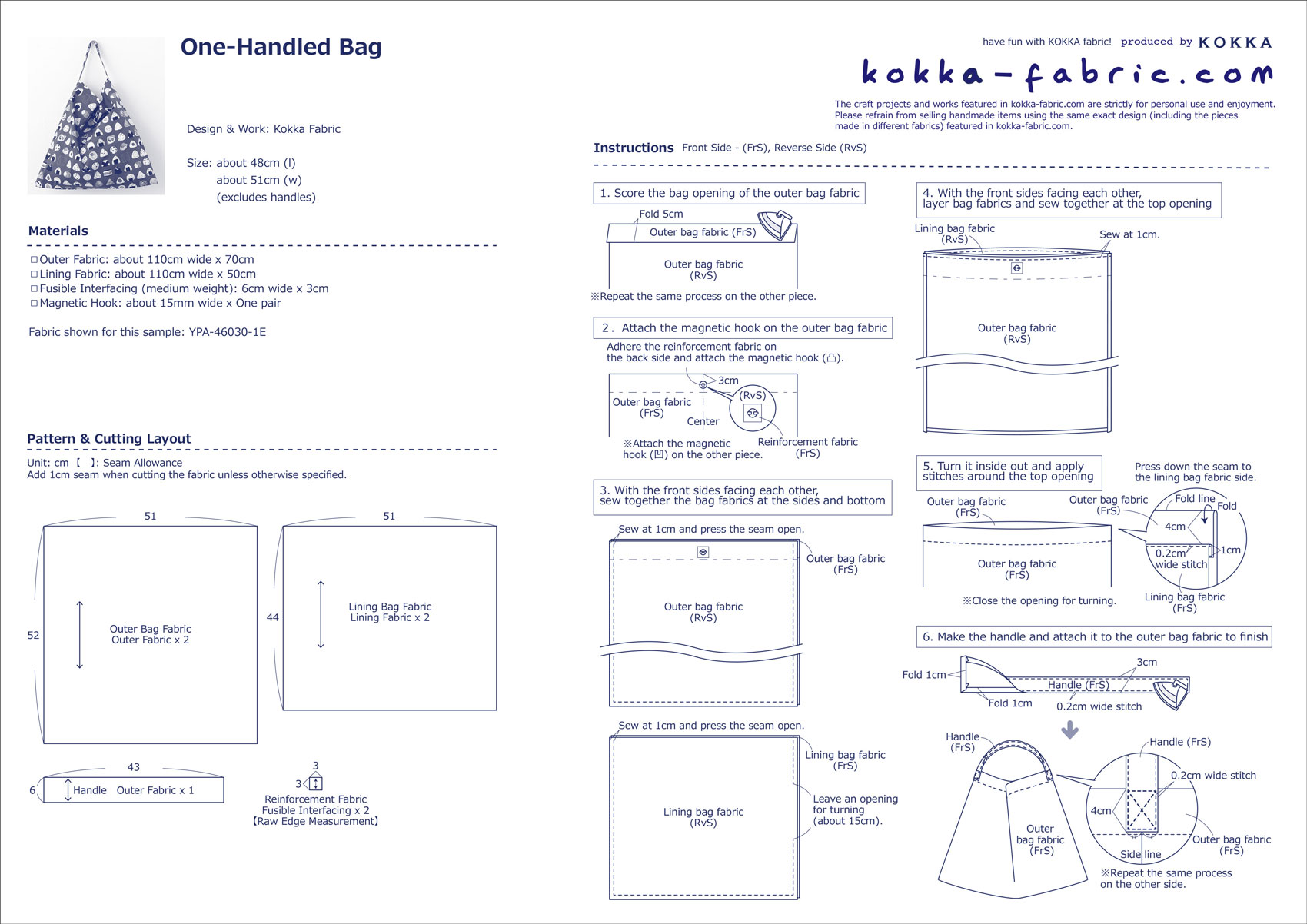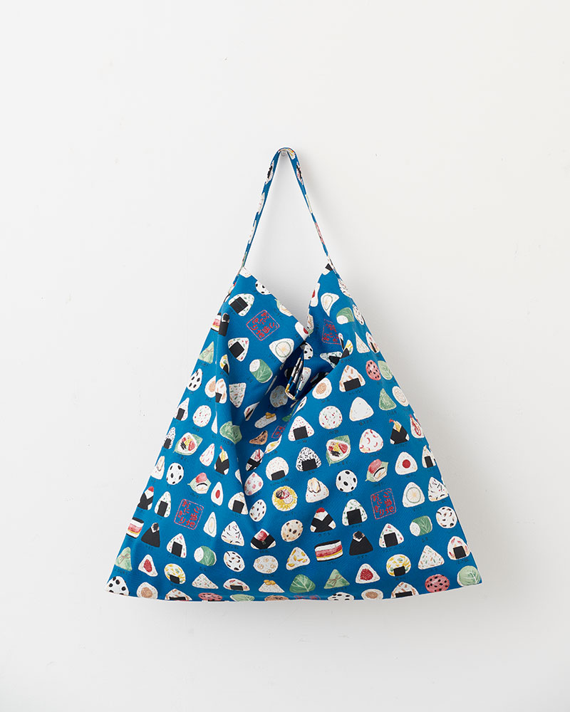 This one-handled bag is popular for its single handle and clean form. The fabric used for this bag is from the “GOTOCHI ONIGIRI” series, which includes 47 types of local rice balls from all over Japan, representing each prefecture. You can make wrapping cloth for lunch boxes and placemats along with the bag. The fabric is 100% cotton oxford, easy-to-handle even for sewing beginners.
