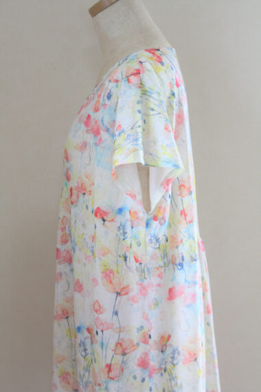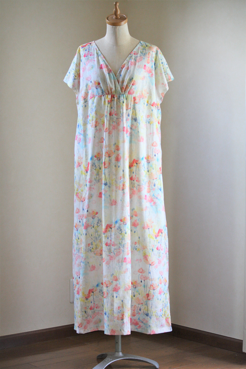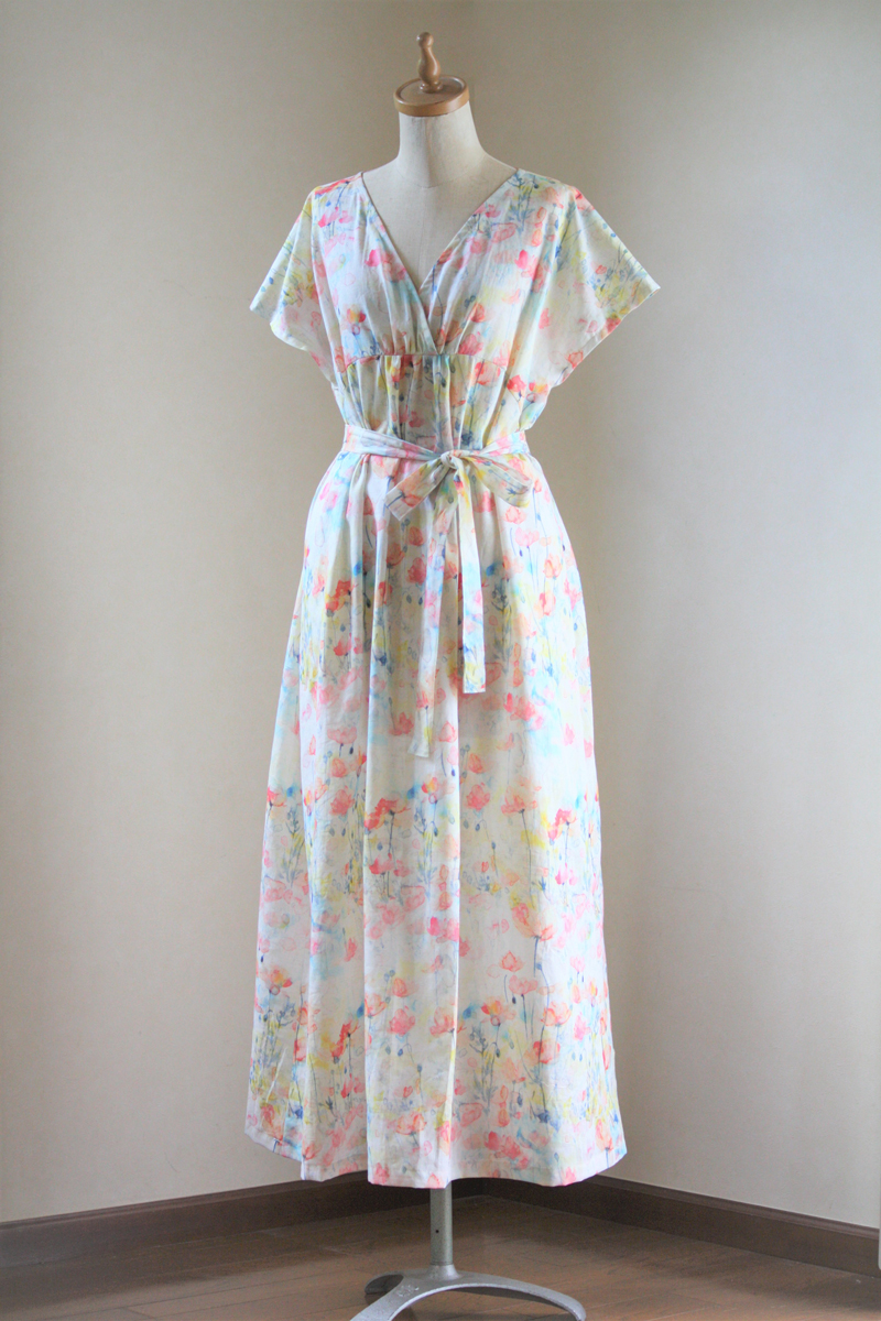Delicate flowers in a field of blooms is the design of this dress, which is accented with a gathered open neckline. For a relaxed look, it can be loosely worn, or for a going out, the dress will look proper with a matching fabric’s ribbon tied around the waist. From the yui series, 85% cotton and 15% linen combination fabric, poppy, is featured.