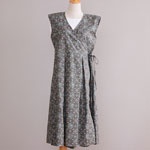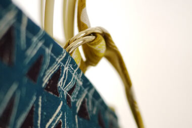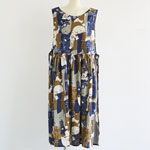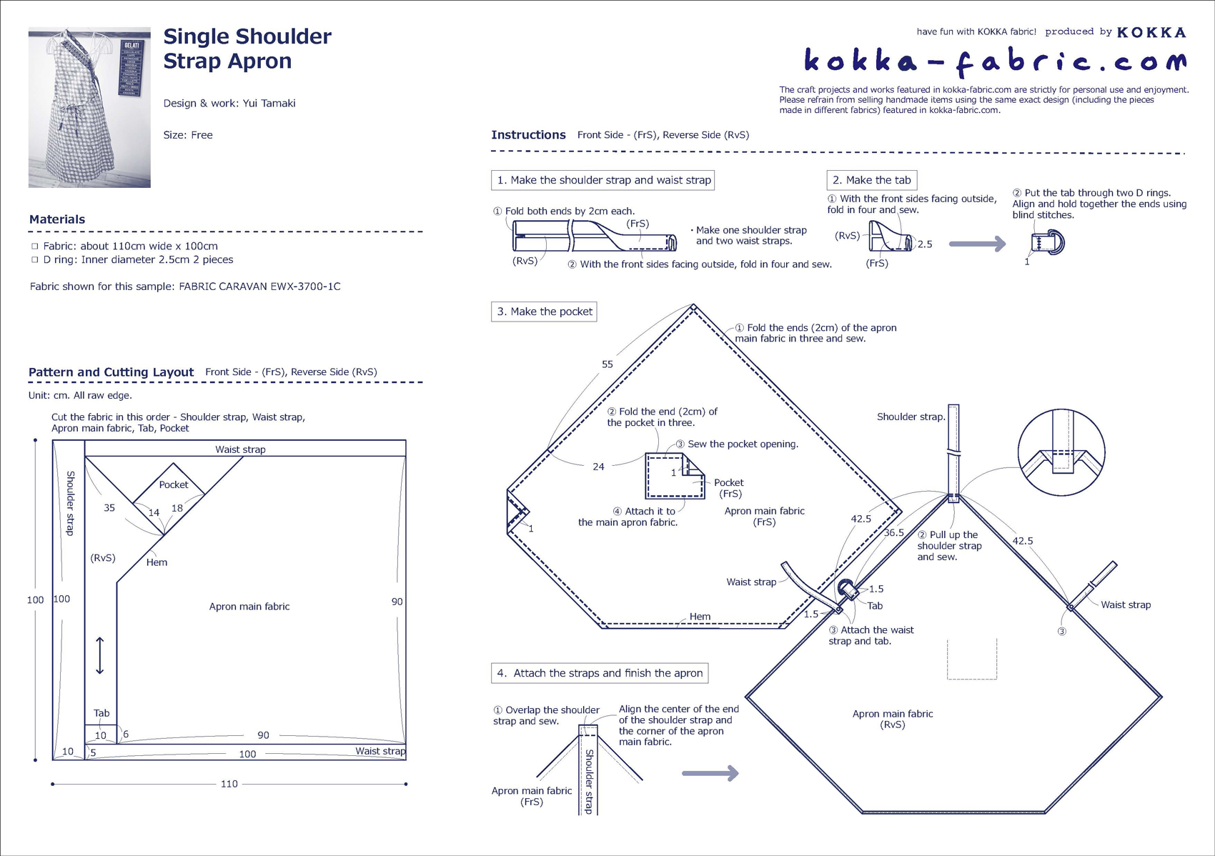 It is stylish yet very easy to make! It is a popular apron with a single shoulder strap. The stone design fabric is from the FABRIC CARAVAN series by Momoko Kinoshita, who is a designer for clothing and bag brand, YURTAO. A different design of the fabric’s edge is used as an accent.