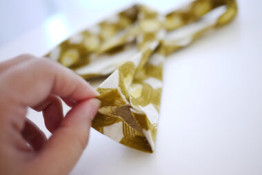 Make the shoulder strap and waist strap (two pieces each). With the short ends inward, gate fold the fabric. Apply stitches at 2mm from the edge.
