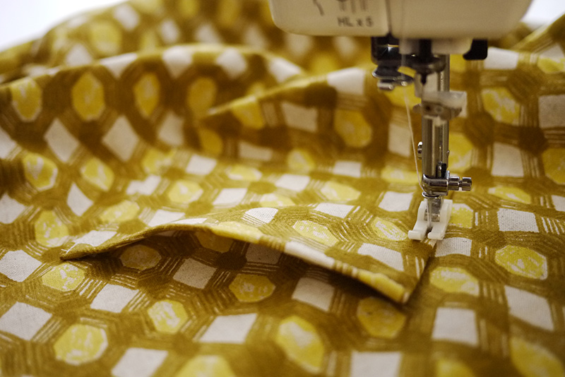 Use the iron to firmly crease the fabric and utilize basting glue. This way the stitches on top of the double folded fabric will come out cleanly. If you are serging the fabric, you only need to fold it once.