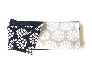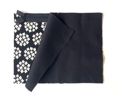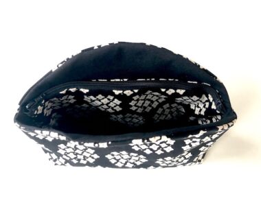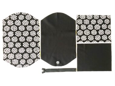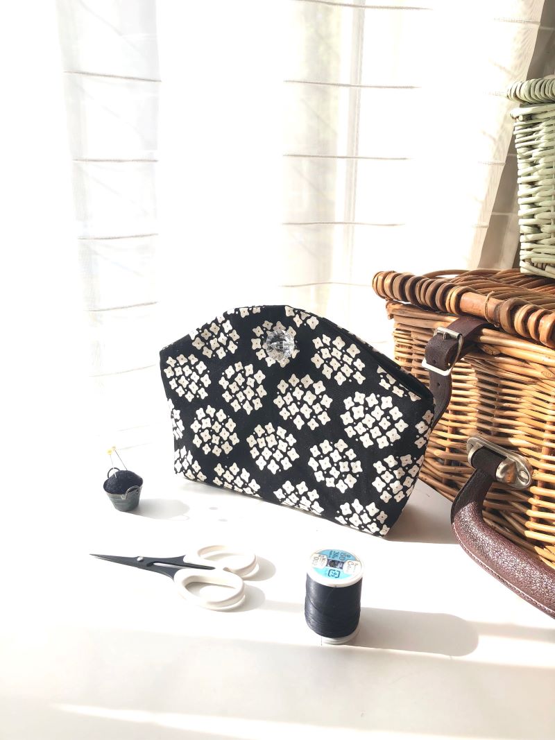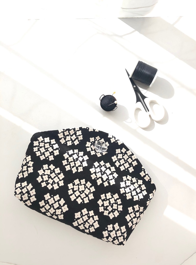 This stylish pouch has a zippered pocket on the inside. The featured fabric is a floral pattern from the “teiban” series. The mature color combination of white flowers on a black background goes well with the simple style of the pouch. The fabric is 100% cotton oxford. This material is suitable for making bags and pouches because of its easy-to-sew thickness.