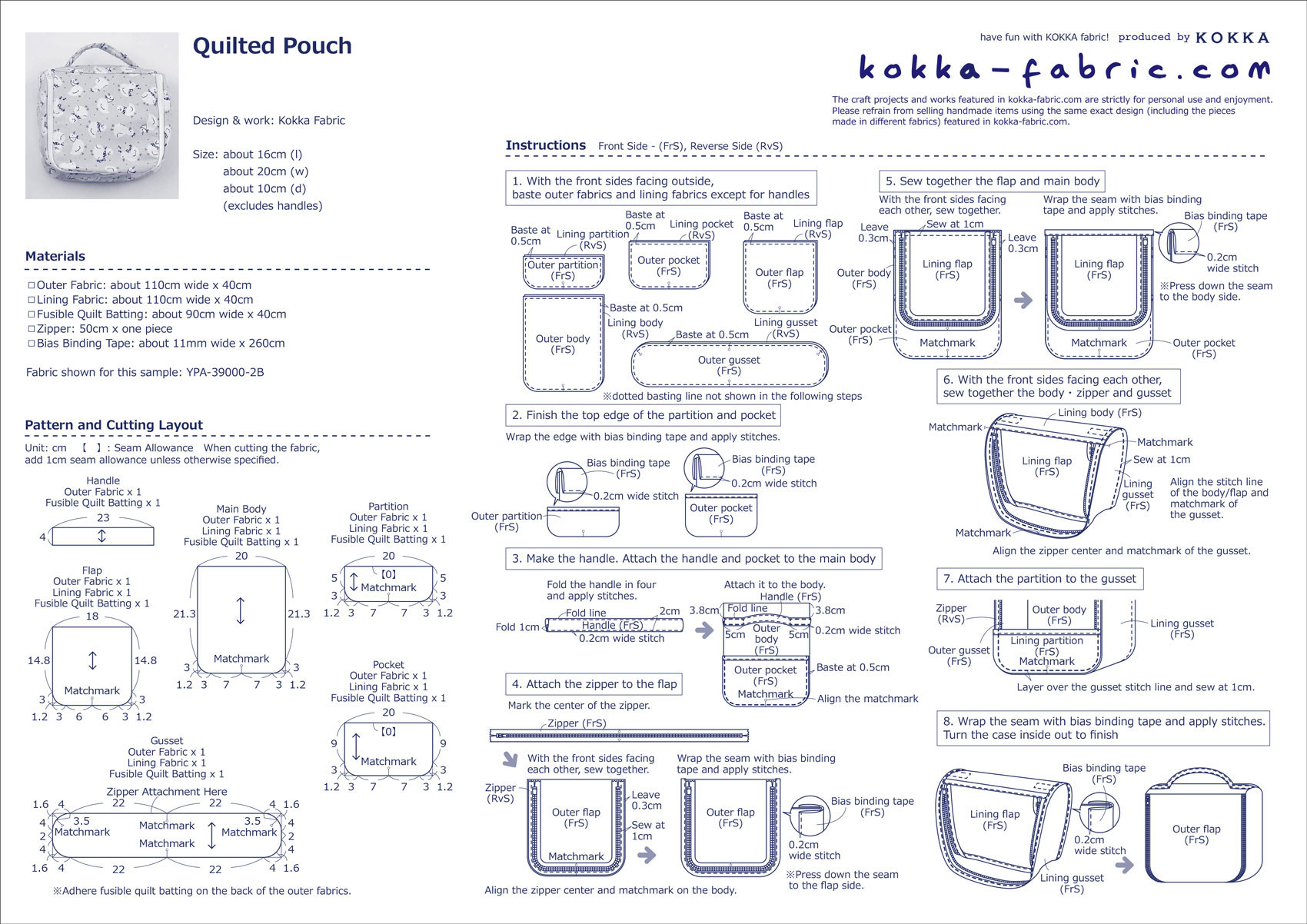 This quilted pouch with a zipper closure and wide-opening lid allows you to easily check the contents♪ It is also convenient for storing cosmetic goods and small items like a vanity case. The featured fabric is from the “Momochan’s Favorite” series. Made of 100% cotton oxford, it is recommended for making nursery and elementary school’s new year handmade goods.