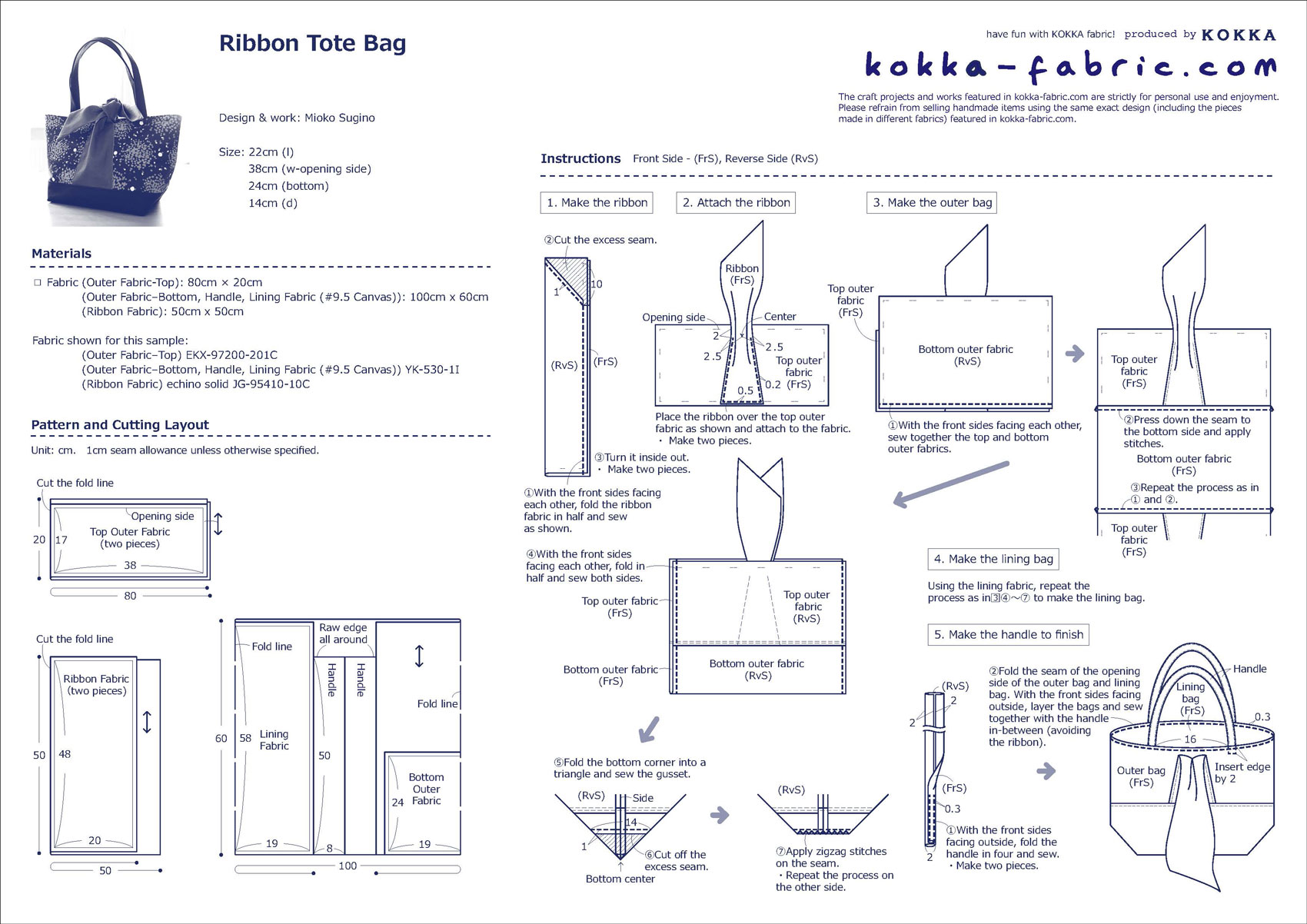 This is a large tote bag accented with a big ribbon. The use of #9.5 canvas for the bottom, lining and handles makes this bag stable and helps keep its shape. For the main portion of the bag, “breeze” from the new echino pattern, “patterns” is used. The ribbon also uses echino’s fabric from its solid line.