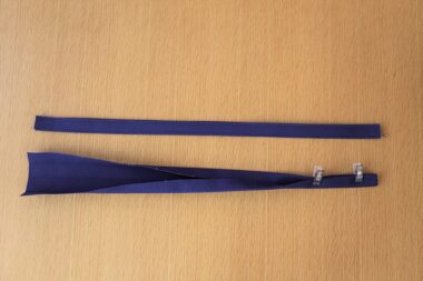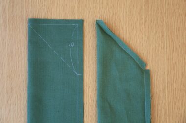 With the front sides facing each other, fold the ribbon fabric in half. Allow for 1cm seam allowance. Draw a diagonal line at 10cm from the corner and cut the piece.