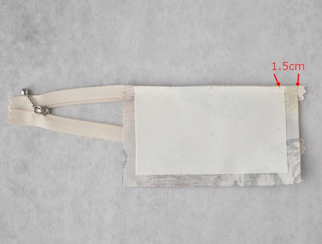 With the front sides facing each other, sew together the zipper with the back side fabric.