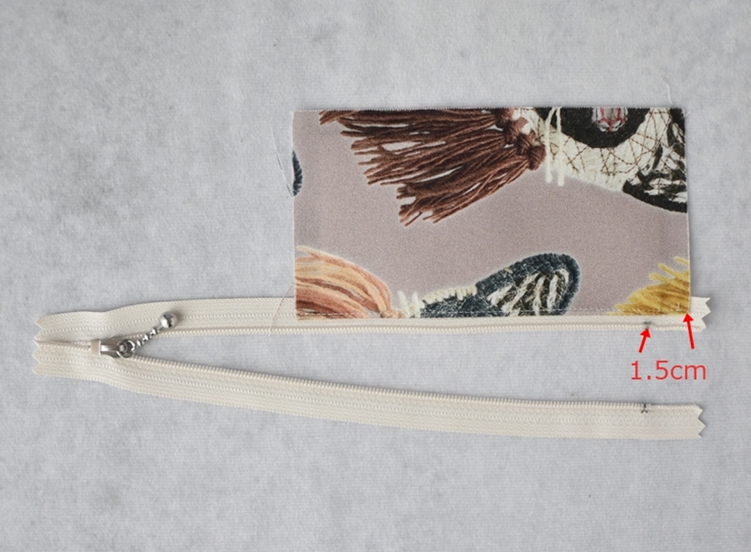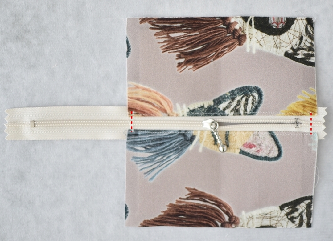 Attach the zipper to the other side as well. Sew at 0.5cm (red dotted line) and secure the zipper and fabric. Cut off excess zipper.