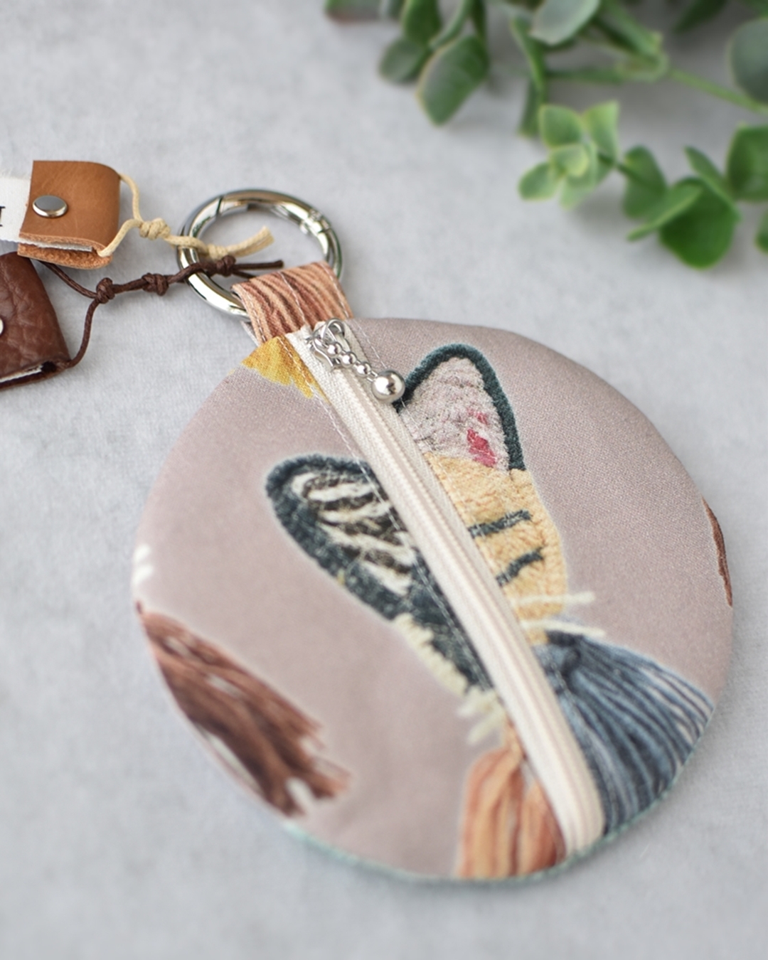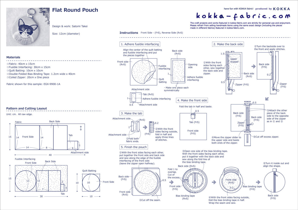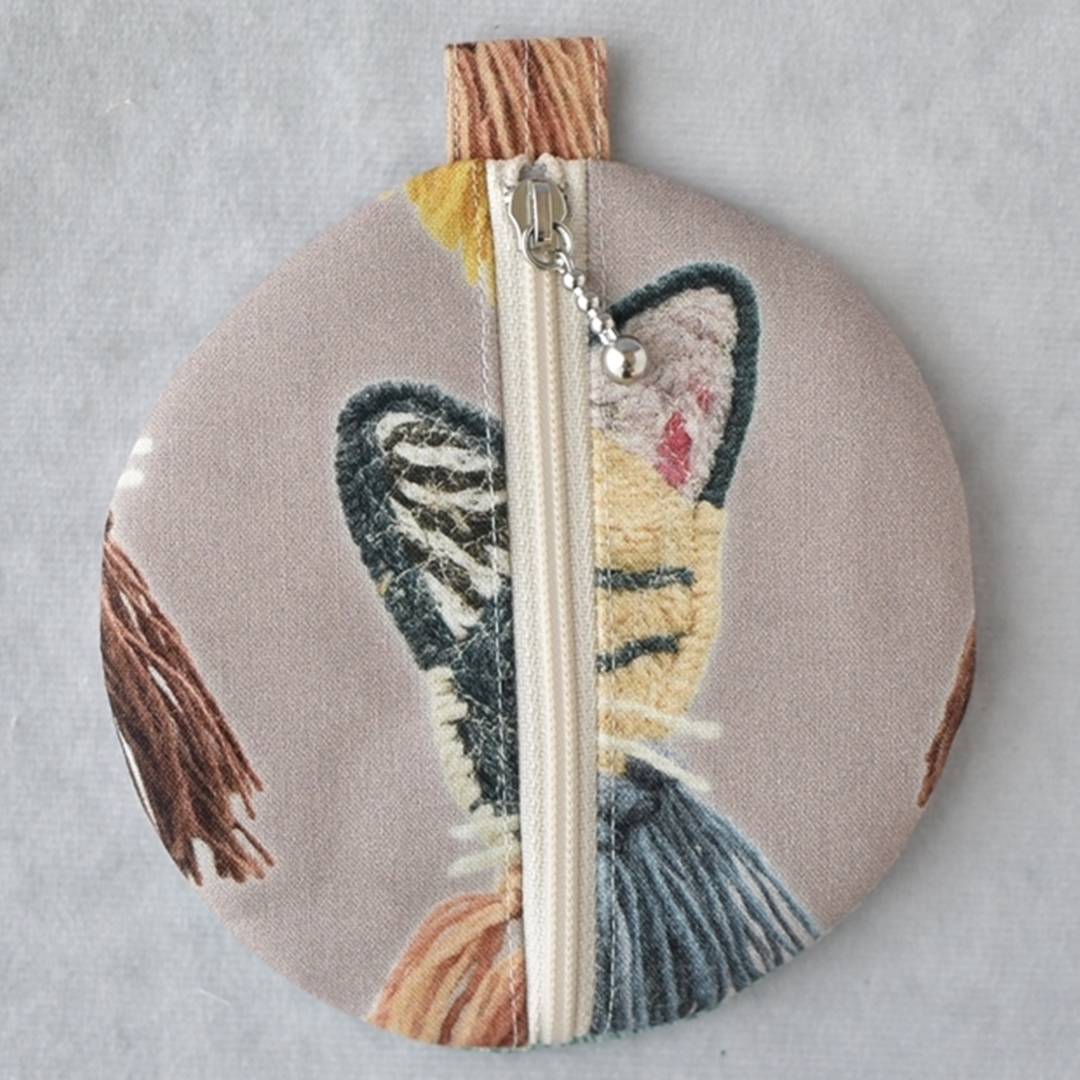 This flat round pouch helps neatly organize small items like keys and lip balm that tend to get lost in your bag. The zipper is attached straight across the back, making it easy enough for a beginner’s sewing project. You can also turn this pouch into a bag charm by attaching a carabiner to the tab. The fabric used for this pouch is [we are cats] by fiber artist Kari Ishikawa. It is 100% cotton sheeting, easy-to-sew, and perfect for making bags and small accessories.