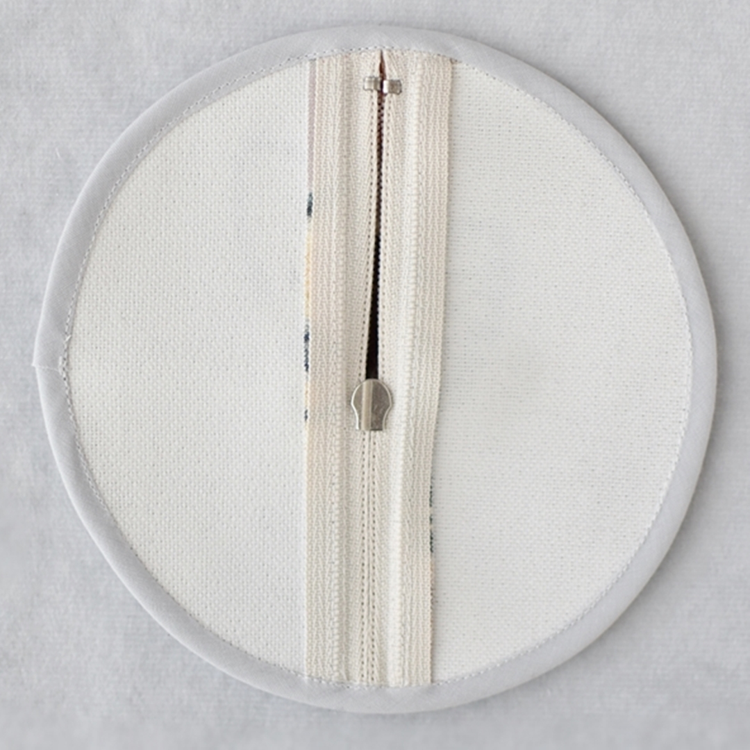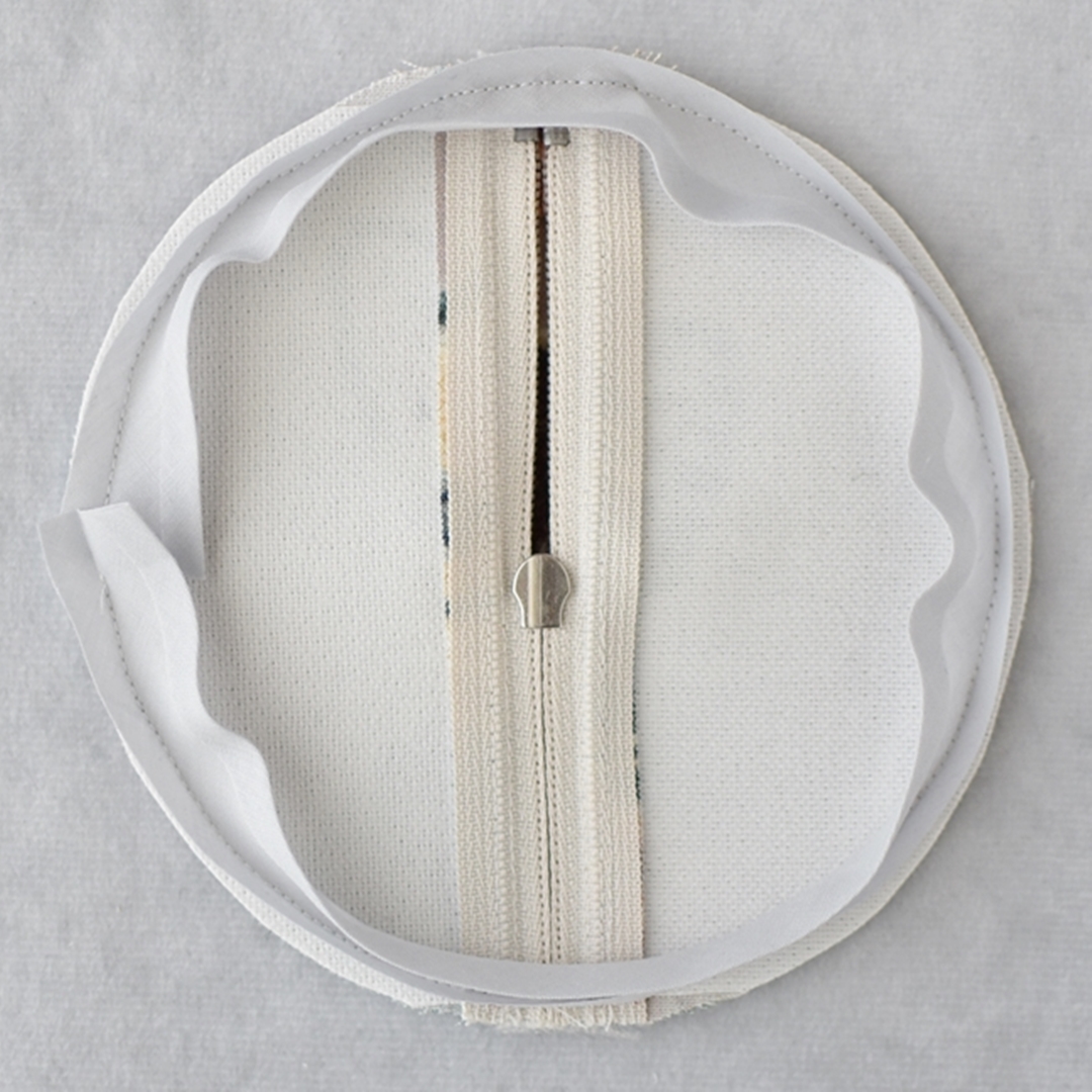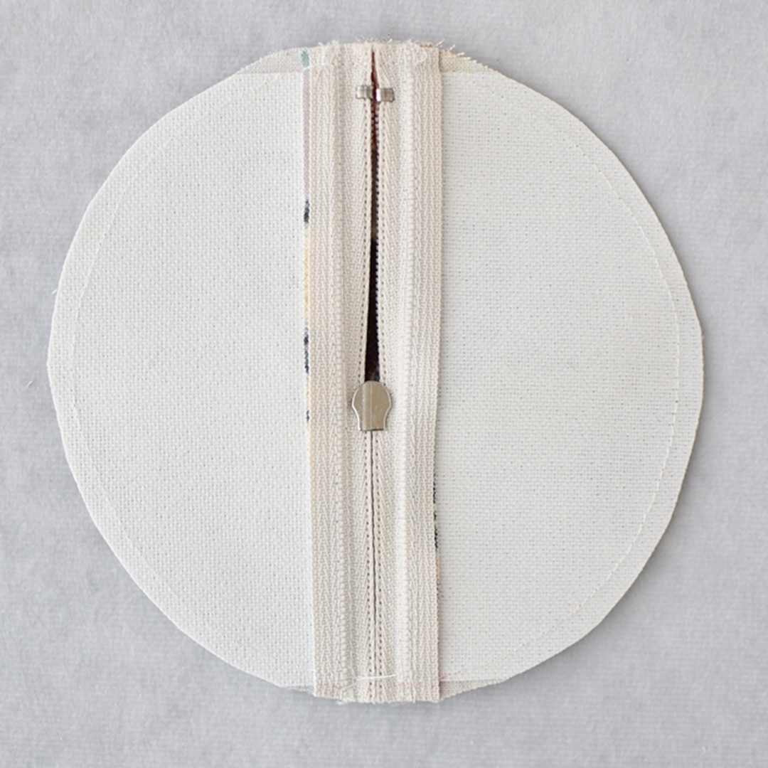 With the front sides facing each other, put together the front outer fabric and back side fabric with clips. Sew along the circle on the front of the fusible interfacing. Leave the zipper half open as the piece will be turned inside out later.