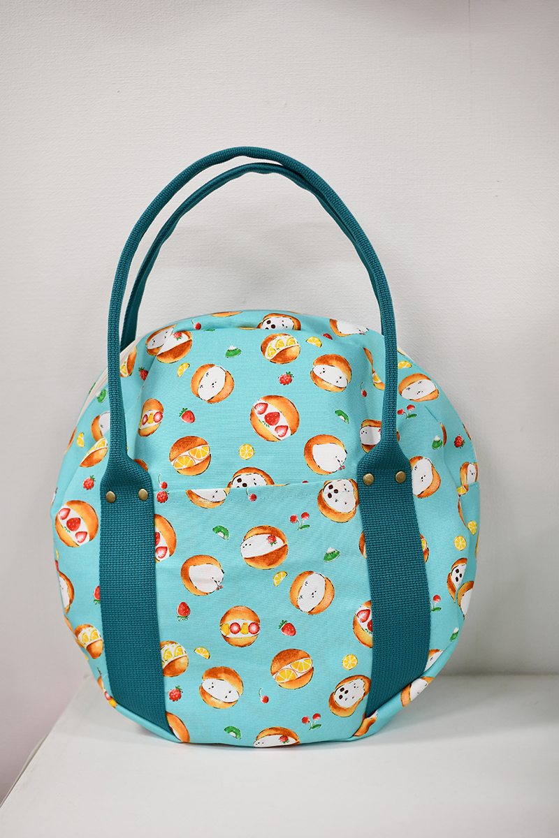 This is a round tote bag with a cute, circular shape. The featured fabric is from the “Delicious Animals” series. Cute animals are peeking out of the buns, together with strawberries and oranges. The 100% cotton oxford fabric is easy to sew and perfect for making bags. The rivet on the handle adds an accent.