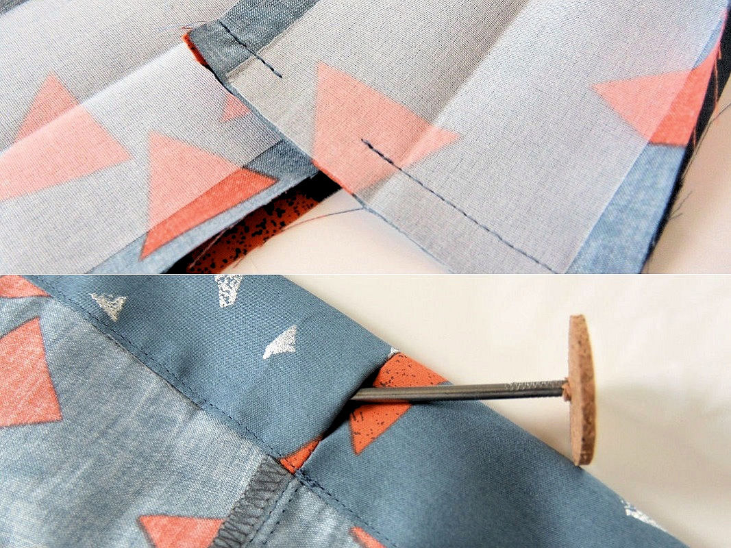 Prepare the pocket. The triangle at the bottom will be straightened to be a solid line when attaching to the pants. So cut a slit at the tip of the triangle. In order to keep the required fabric to 2m, two pockets are placed in the pattern within the fabric’s width with straight grain line. If you have extra fabric, you may want to cut the fabric so that the opening will be a bias. This way, you can achieve a better cascade look.