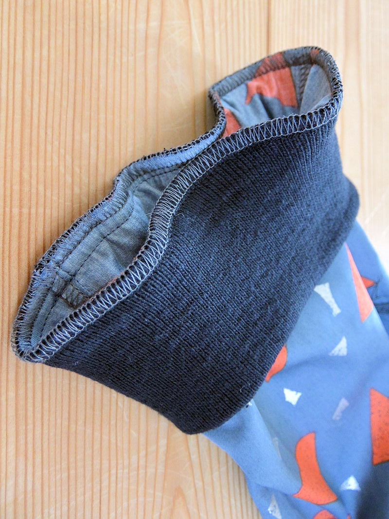 Attach the rib to the hem. After putting the elastic through the waist, try it on to adjust the length.