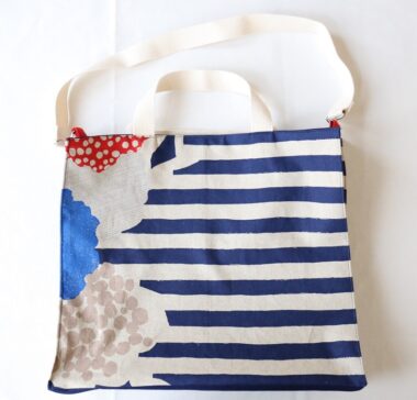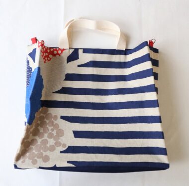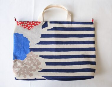 This is a large shopping bag with a stylish square shape. A strap is also attached so that you can carry it over your shoulder. The echino’s new design, bright is the featured fabric. The echino-like vivid motif looks attractive against the crisp border in this cotton linen canvas. An asymmetric look is achieved by highlighting the border on the front while placing the motif on one side.