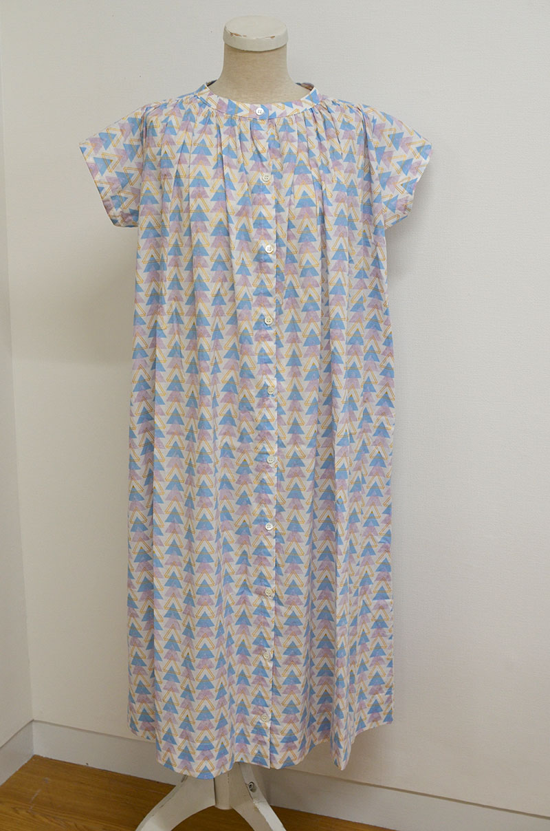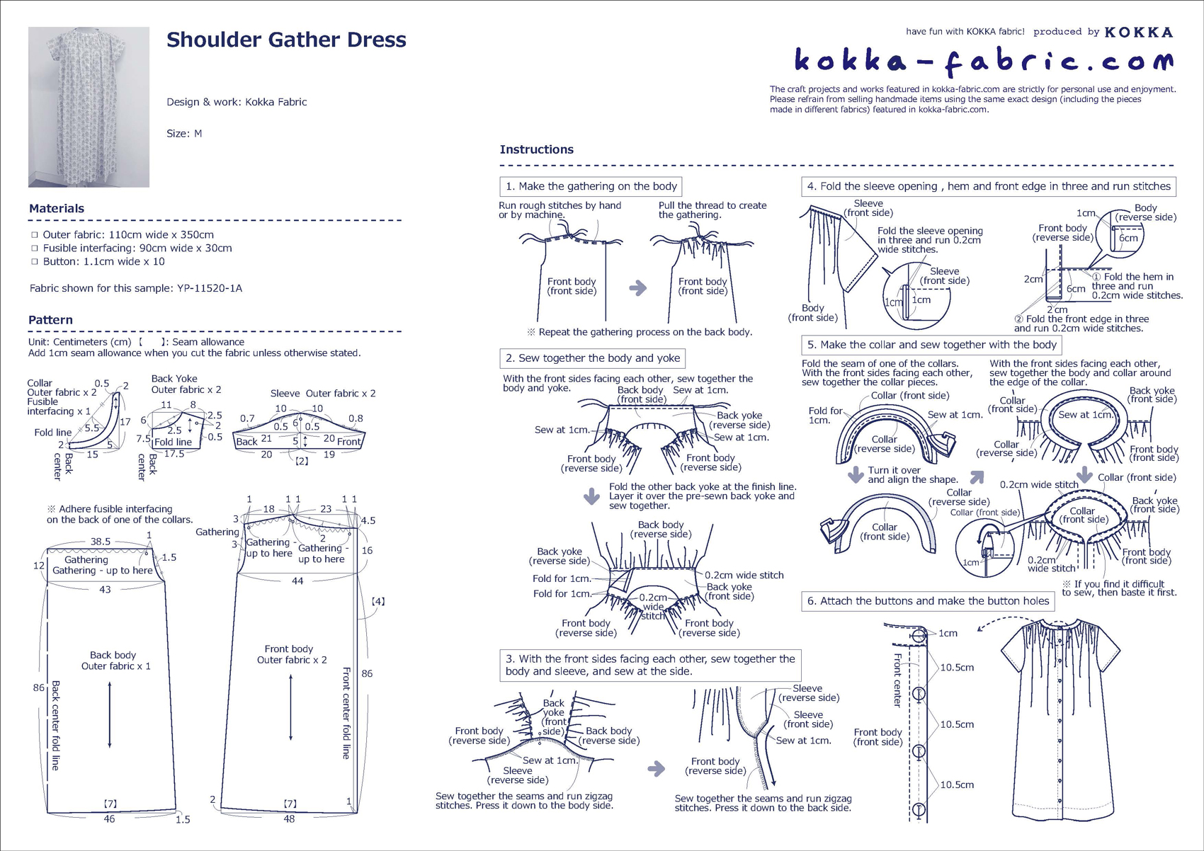 The featured project is a long length dress with softly gathered shoulder detail. It can be enjoyed as an everyday dress for relaxing moments at home. Open the front buttons and coordinate it with a T-shirt and a pair of jeans underneath, and it will turn this dress into a perfect piece for going out. The fabric is a 100% cotton lawn from the colorful stone series.