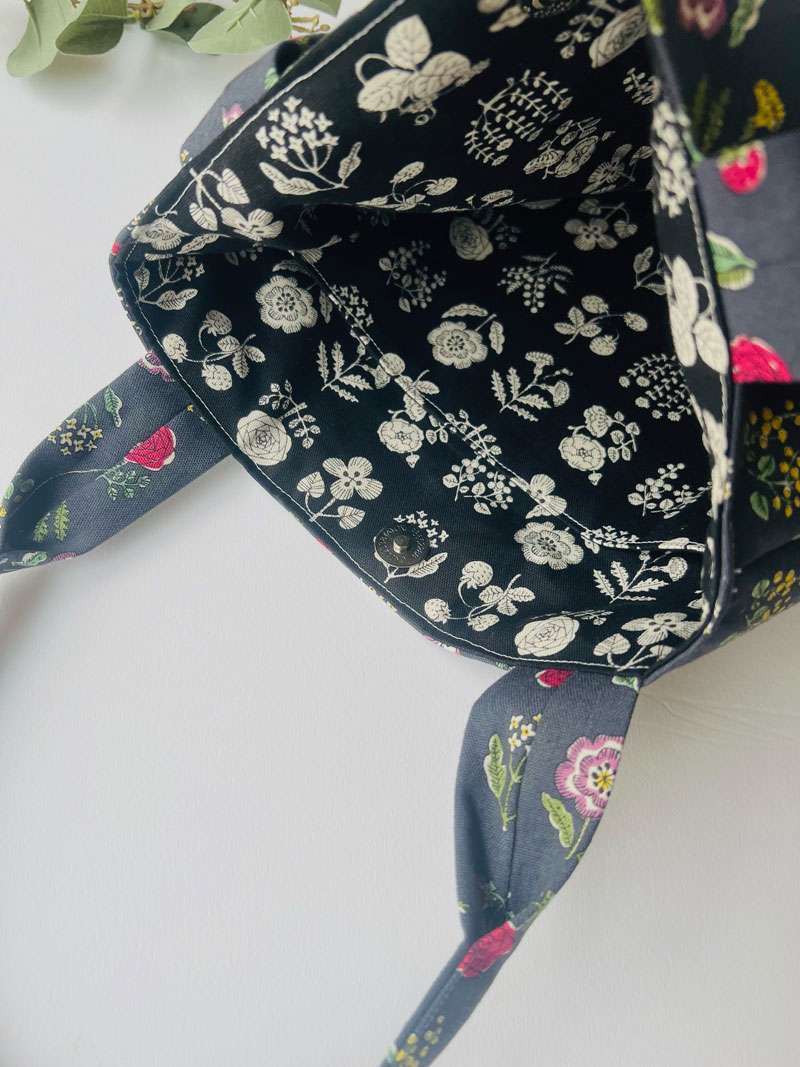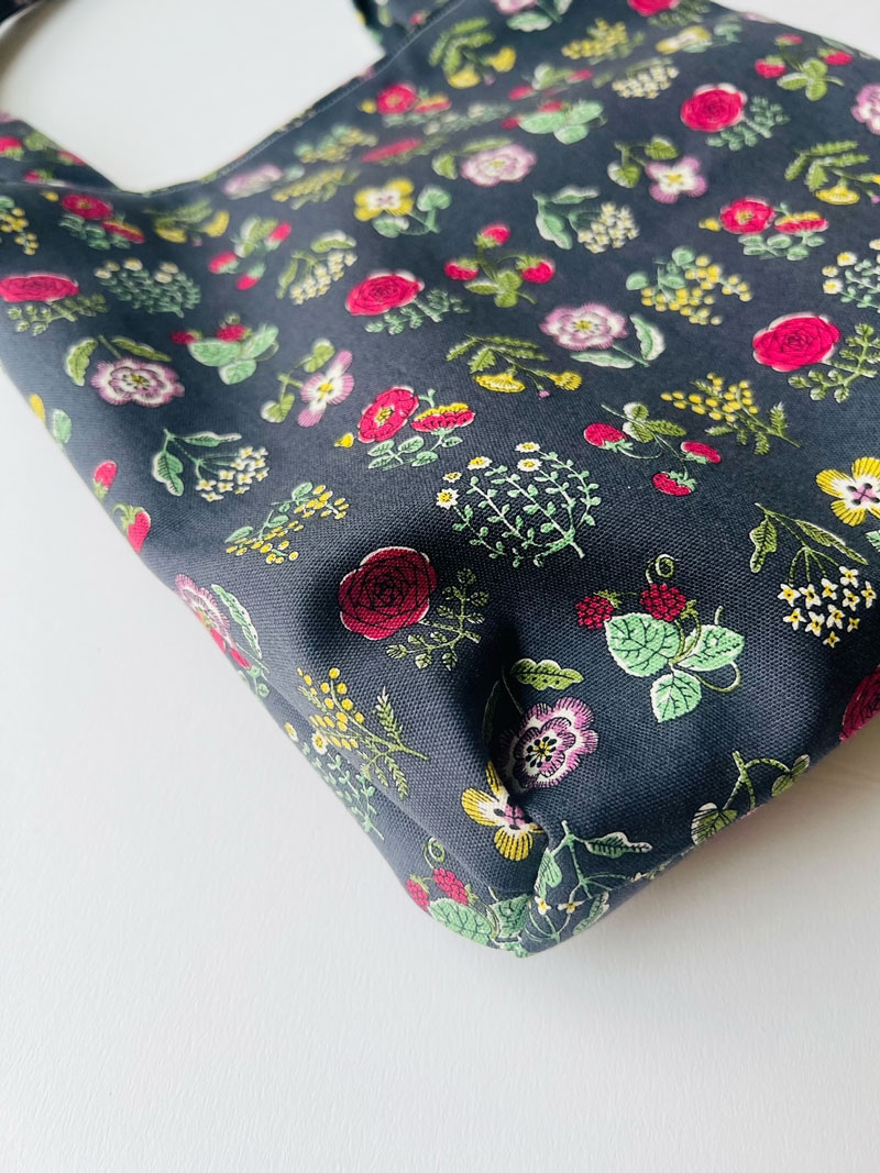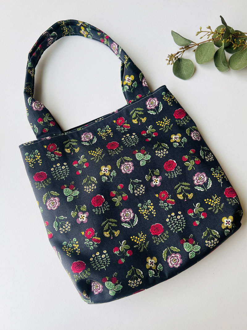 This tote bag can be carried over the shoulder or over the arm. The secret to its cuteness is the dimpled gusset and trapezoidal silhouette. The “Linnea” series’ floral pattern fabric features flowers facing both up and down, so you don’t have to worry about the orientation when using. The 100% cotton oxford is easy to sew and perfect for bag making.