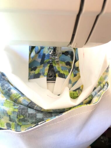 Turn it inside out. Place the lining fabric into the outer fabric (right at the half point of the opening.)