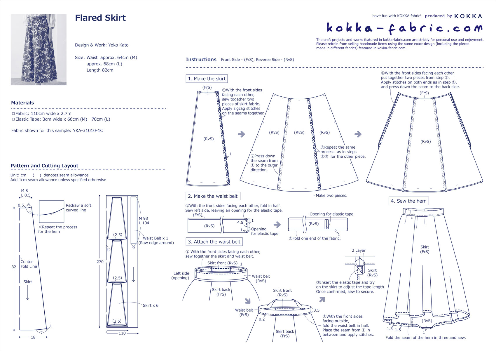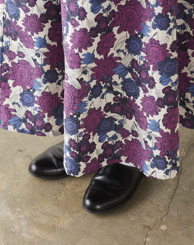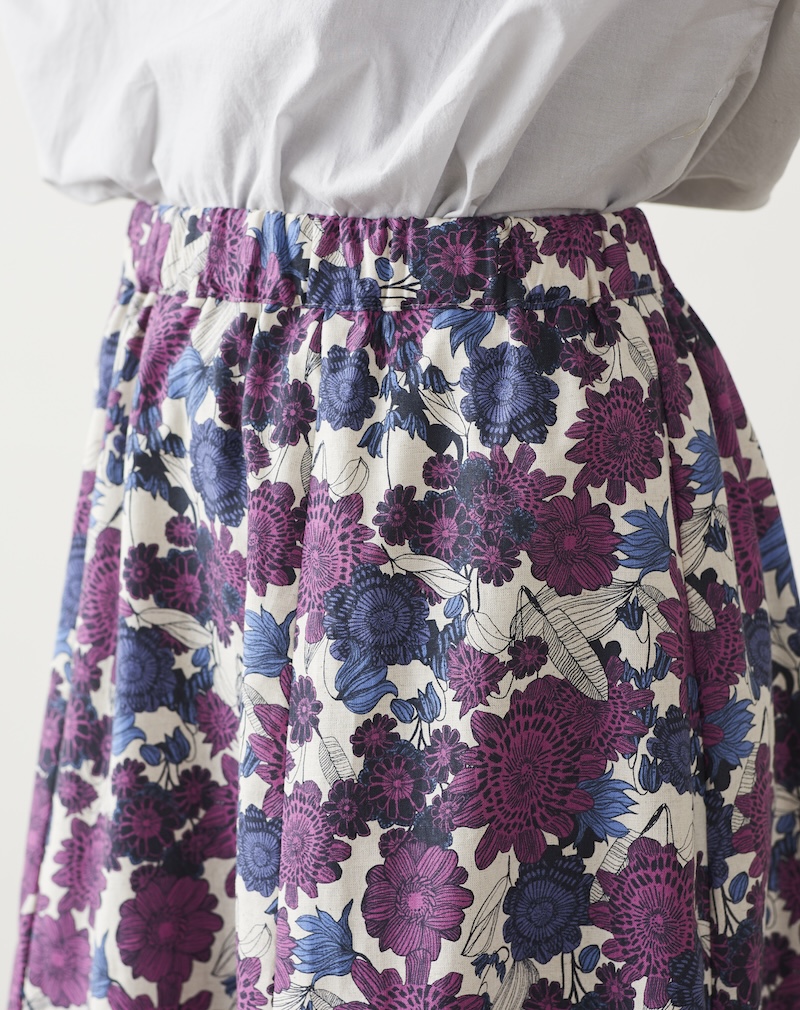 This skirt features six fabric panels for its beautiful flares. The trapezoidal pattern minimizes the amount of fabric, creating a sleek look around the waist. The fabric used for this skirt is from the “Linnea” series with a large floral pattern. The chic purple color gives it a mature look. It is a cotton linen sheeting that allows you to enjoy its natural texture.