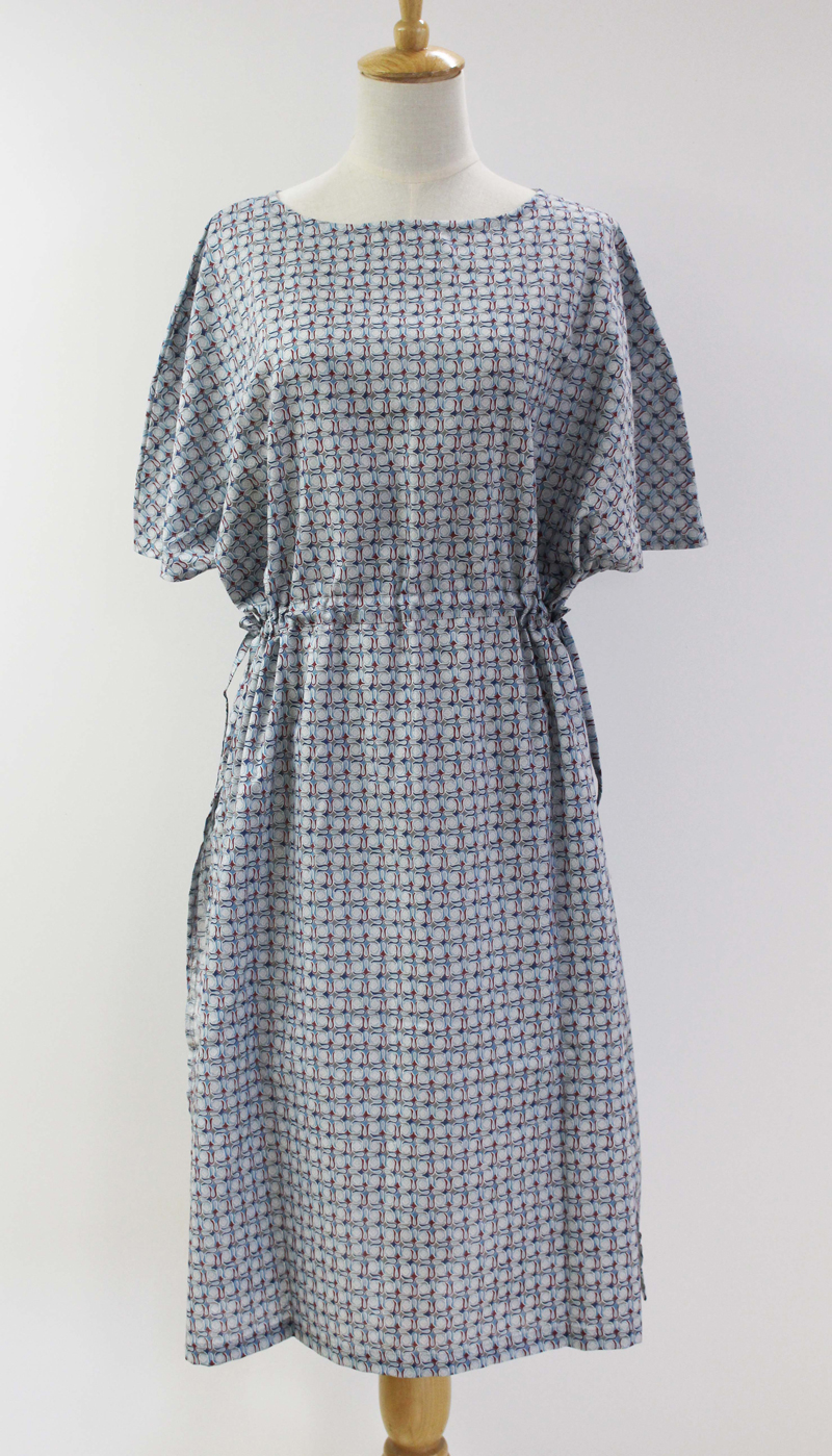 This dress with a deeper side slit can be enjoyed casually with a pair of sandals, or as an attractive piece for a layered look with an inner skirt or a pair of denim. A lovely touch is added for tie-at-the waist cord made with the same fabric.