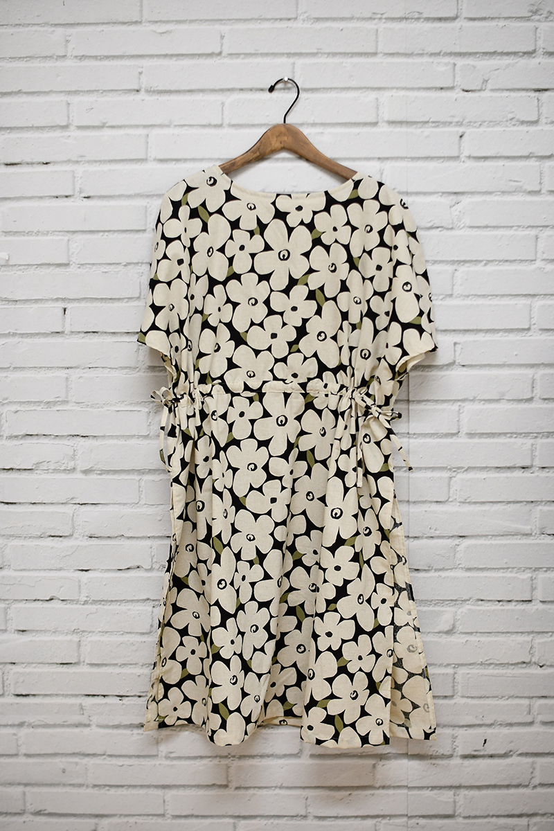 This dress is highlighted with a large floral design, as if to bring the feel of spring early. It has a deep slit on the side of the skirt, which makes it easy to move around and it enhances the look of layered styling. In the still cold season, you can enjoy it with a sweater, a long T-shirt, or denim pants. The featured fabric is from the “Black & White” series. It is a cotton linen sheeting.