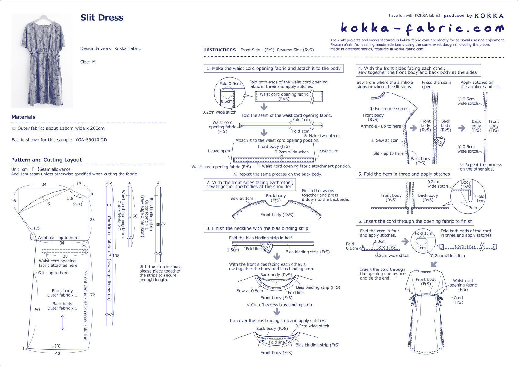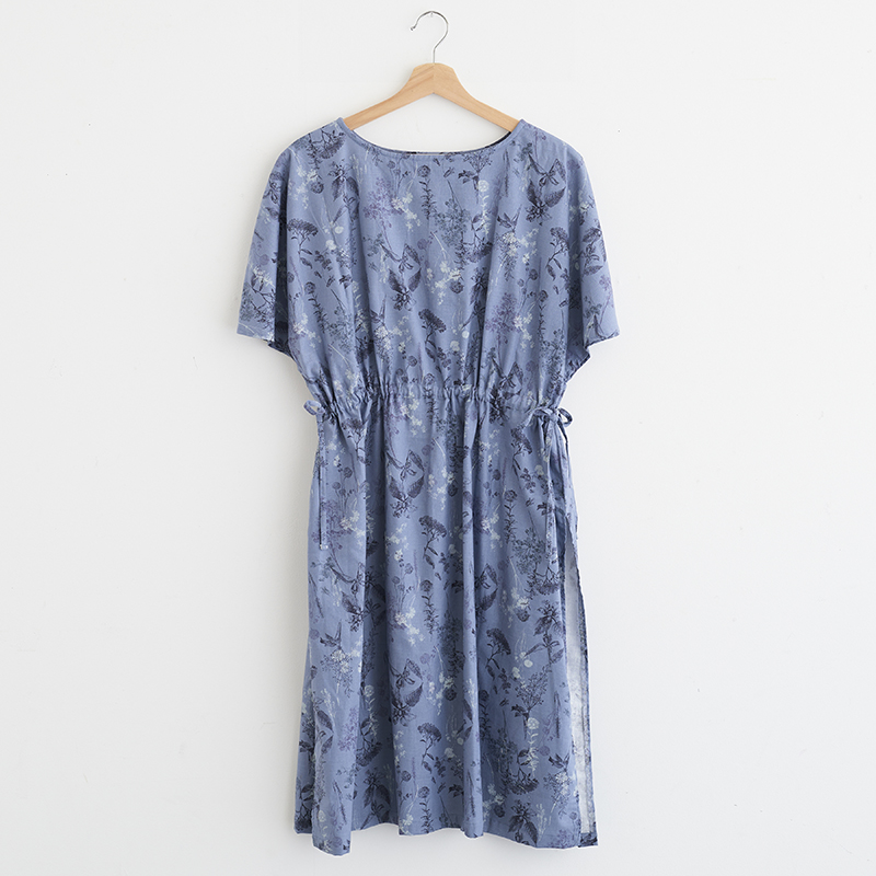 This slit dress is highlighted with a deep slit and a ribbon at the waist. The featured fabric is from the “Natural Garden” series. The elegant botanical pattern gives a soft impression without being too noisy, even with patterns all over the dress. Cotton linen sheeting is also perfect for making clothing.